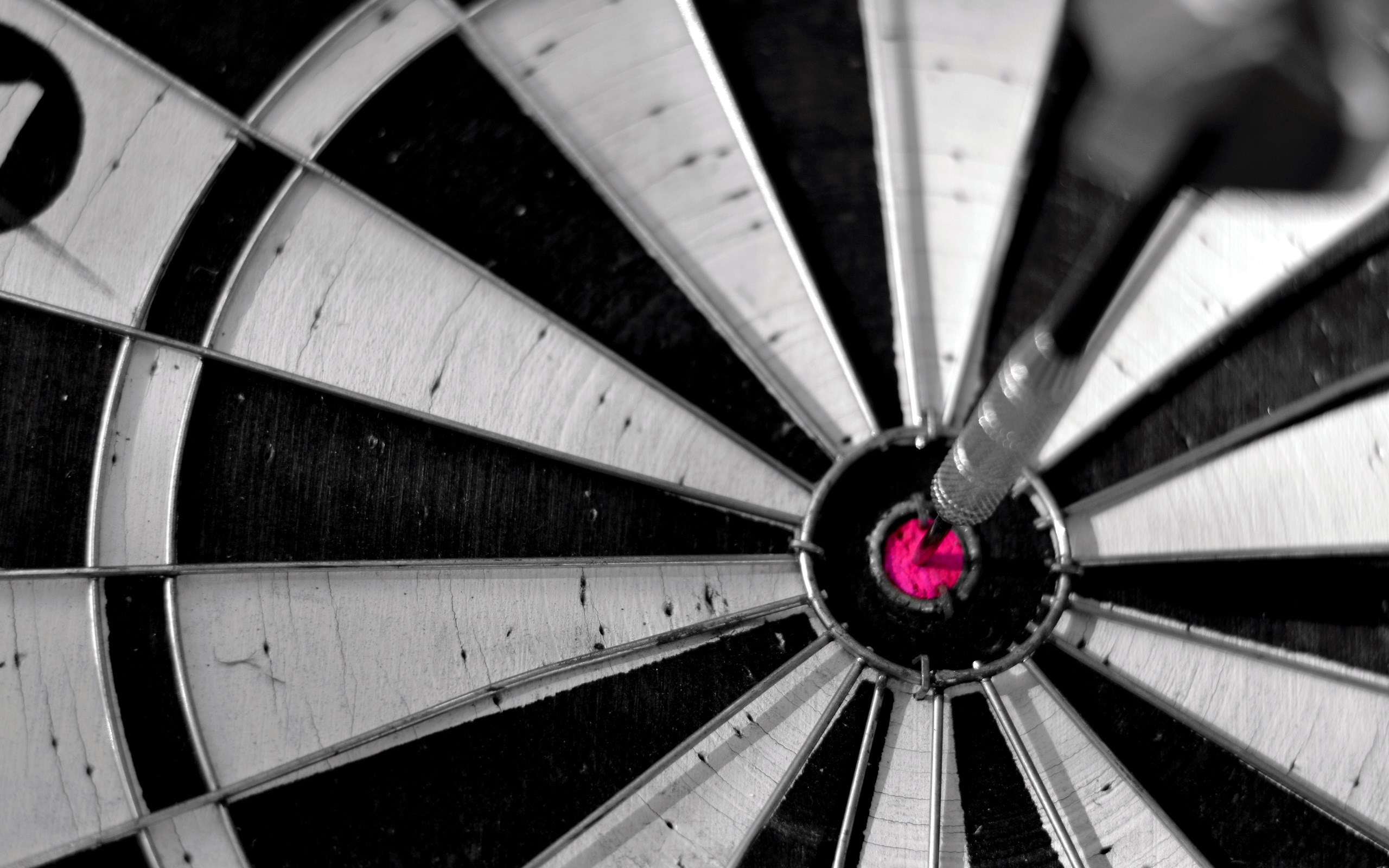 Description: A dart hitting a red bulls eye in a bulls eye dartboard with a black background and a red dart in the center.