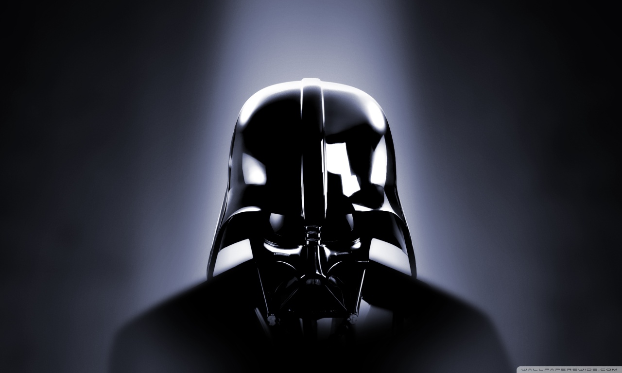 Description: A black and white photo of a darth vader helmet in the dark room with a spotlight behind it.