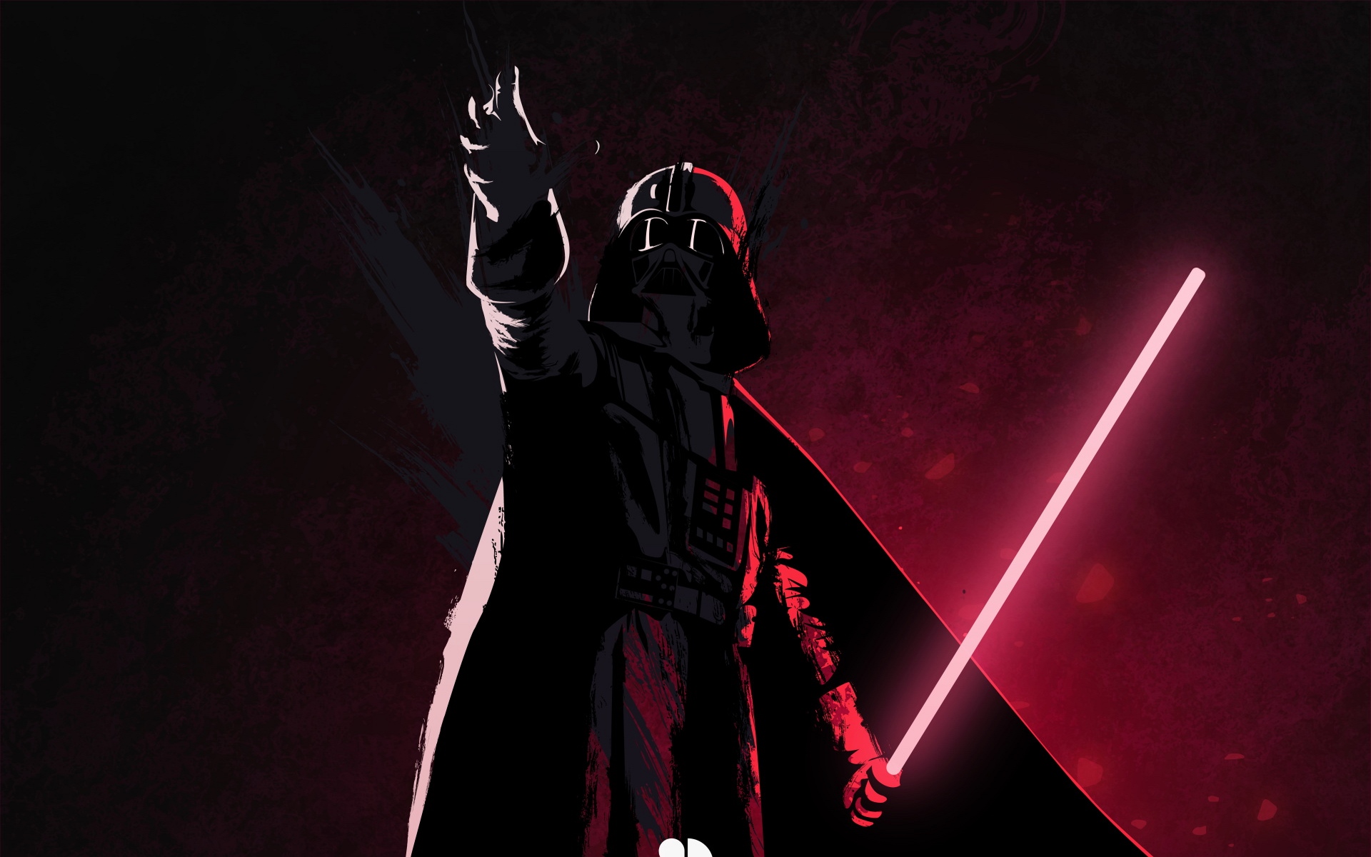 Description: A man in a darth vader costume holding a light saber in his hand and a red light behind him.