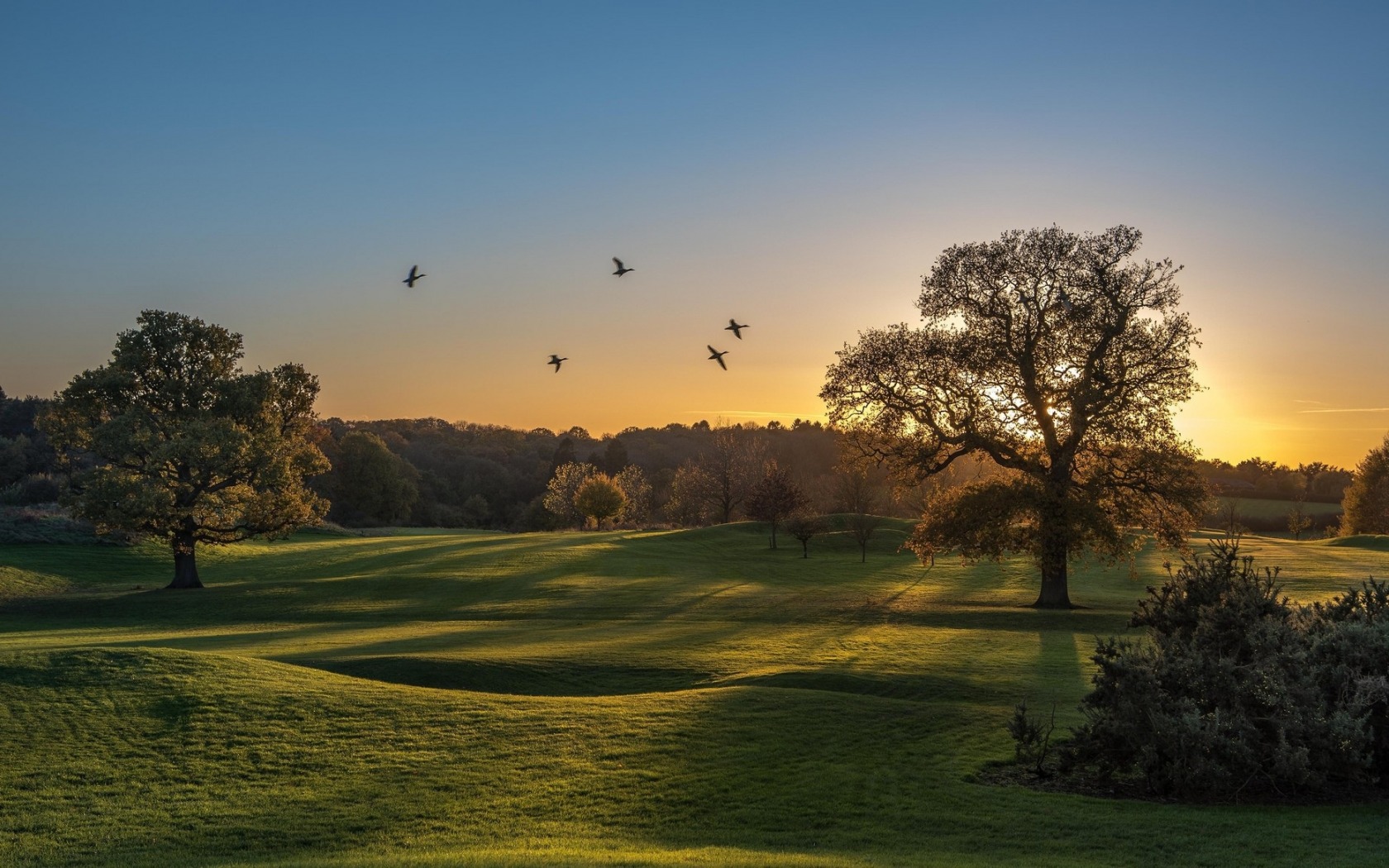 Description: A field with a tree and birds flying over it at sunset or dawn or dawn or dawn or dawn.
