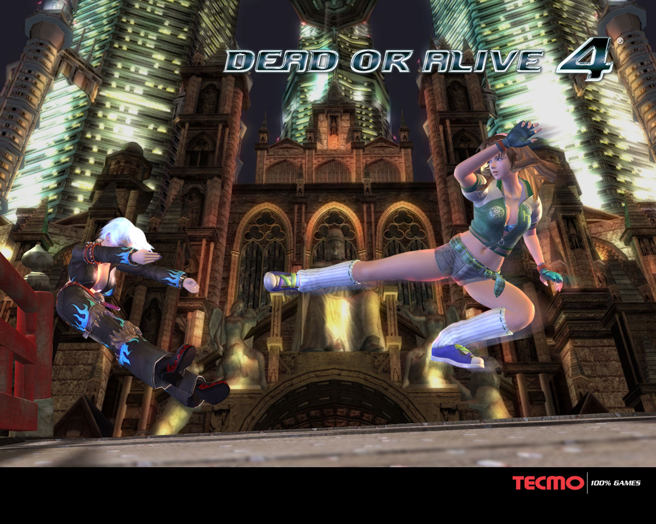 Description: A video game with two women in front of a clock tower and a clock tower in the background with the words dead or alive 4.