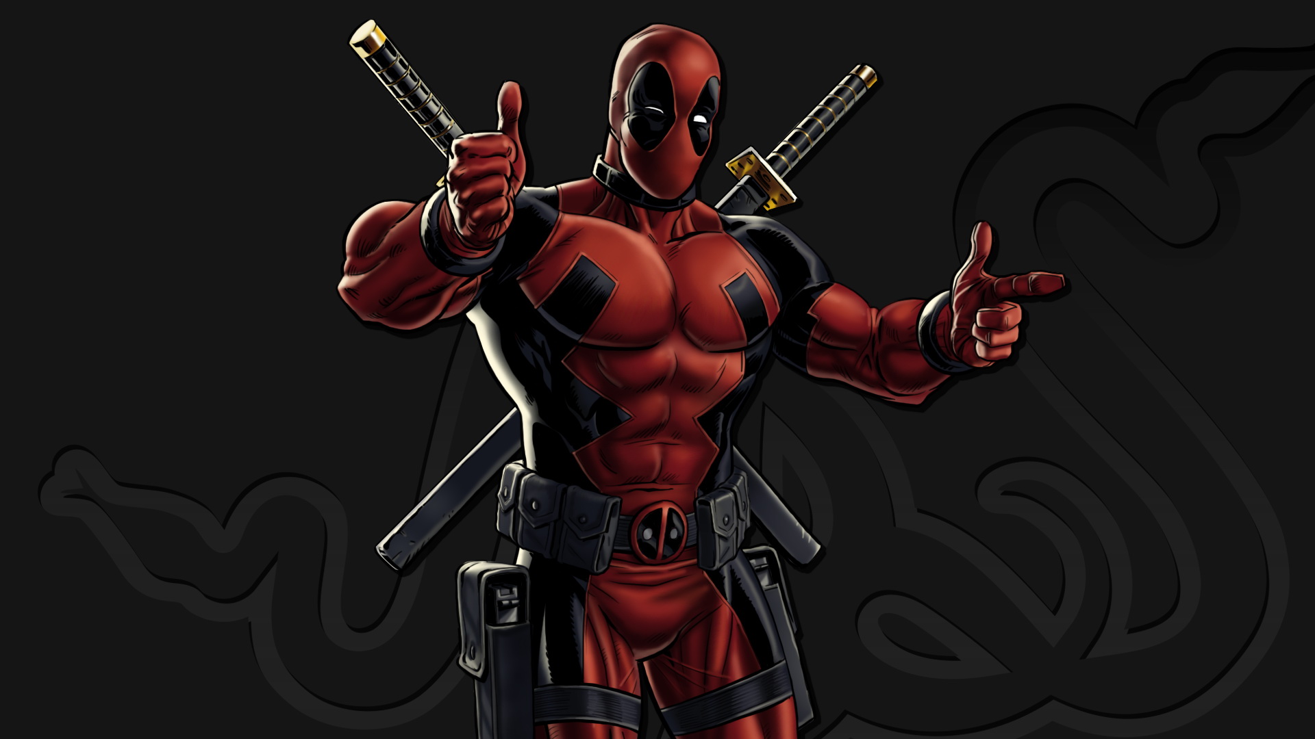 Description: A deadpool character with two swords in his hands and a black background with a black background and a black background with a black background.