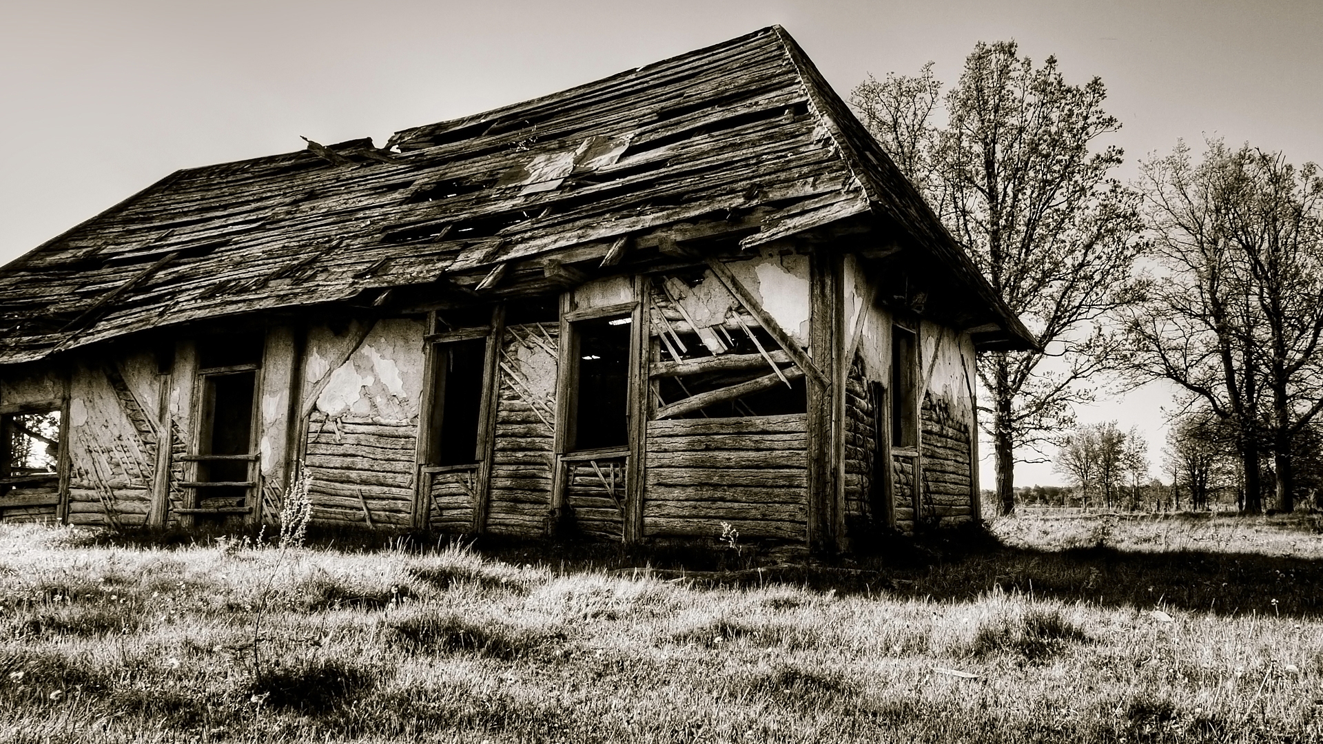Description: A run down building with a broken window and a broken roof in a field with trees and grass in the background.