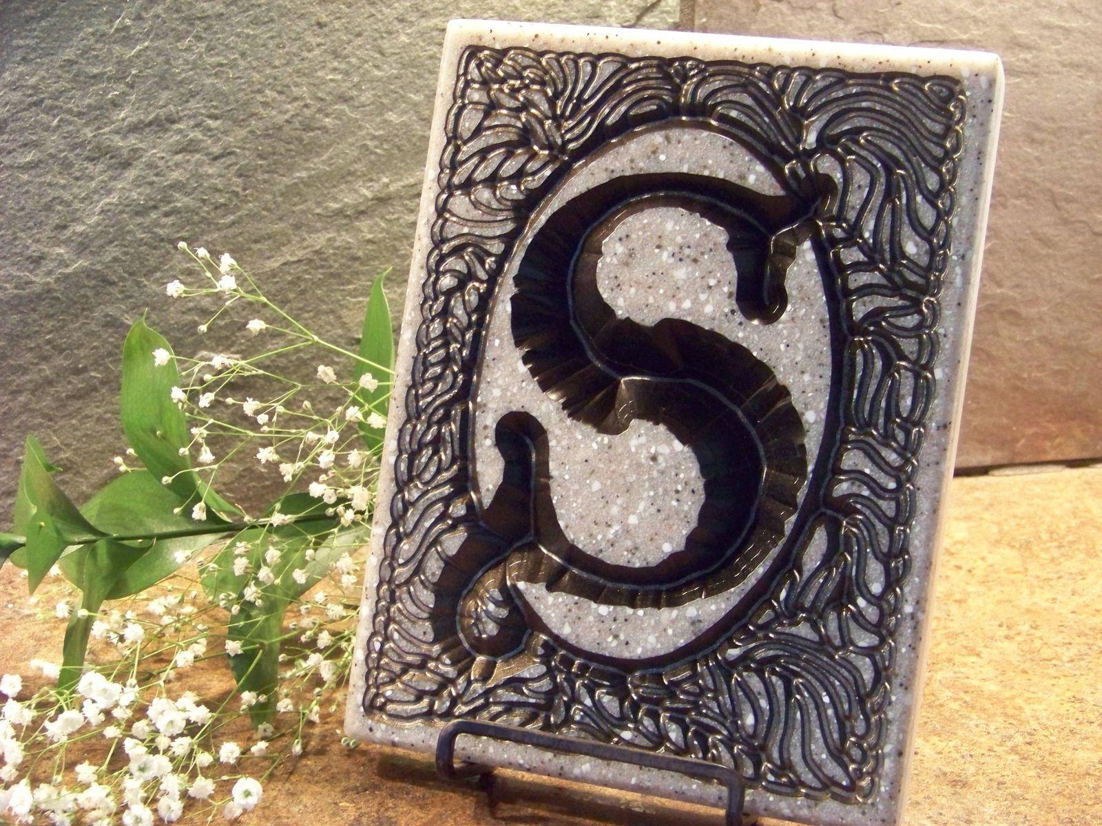 Description: A decorative sign with a snake on it next to flowers and a stone wall behind it with a plant.