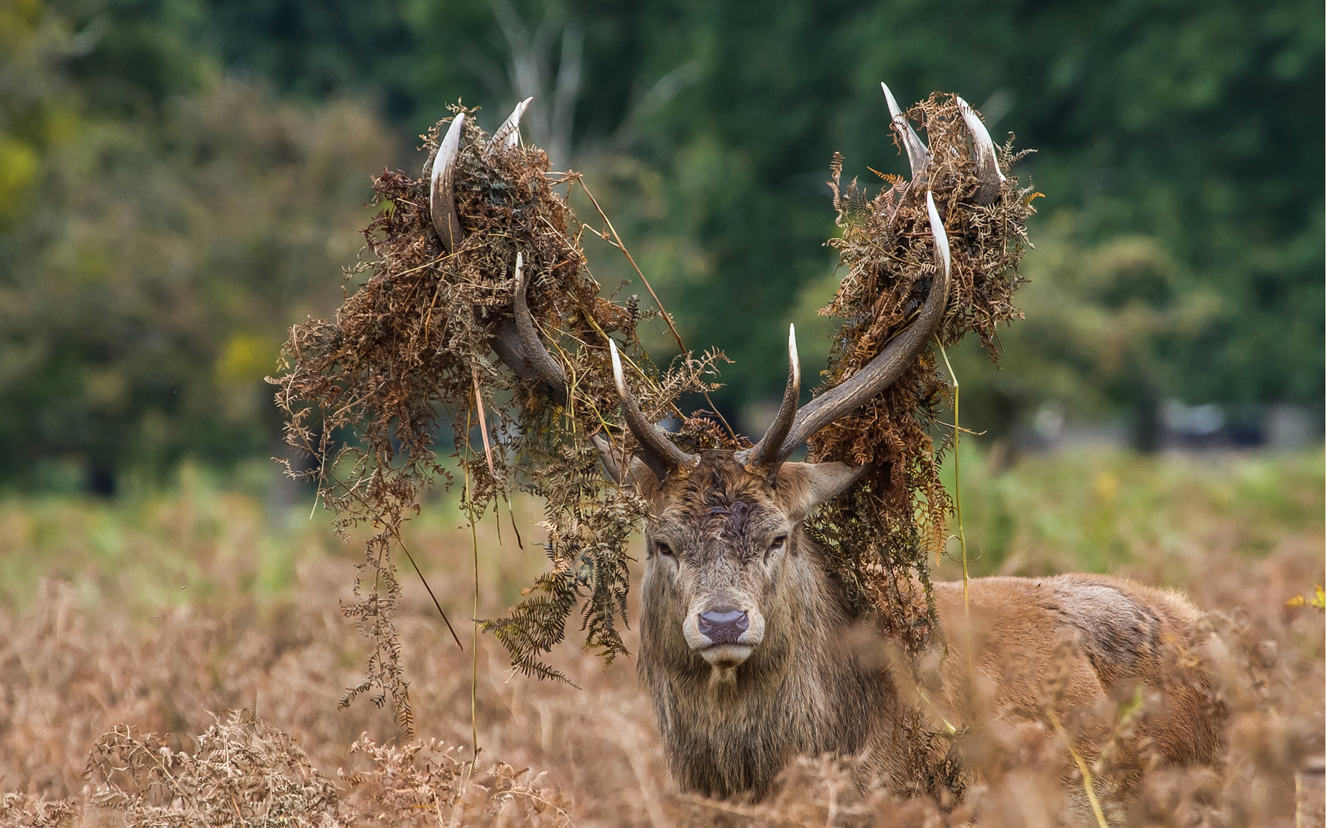Description: A deer with horns and antlers standing in a field of dry grass with trees in the background and bushes in the foreground.