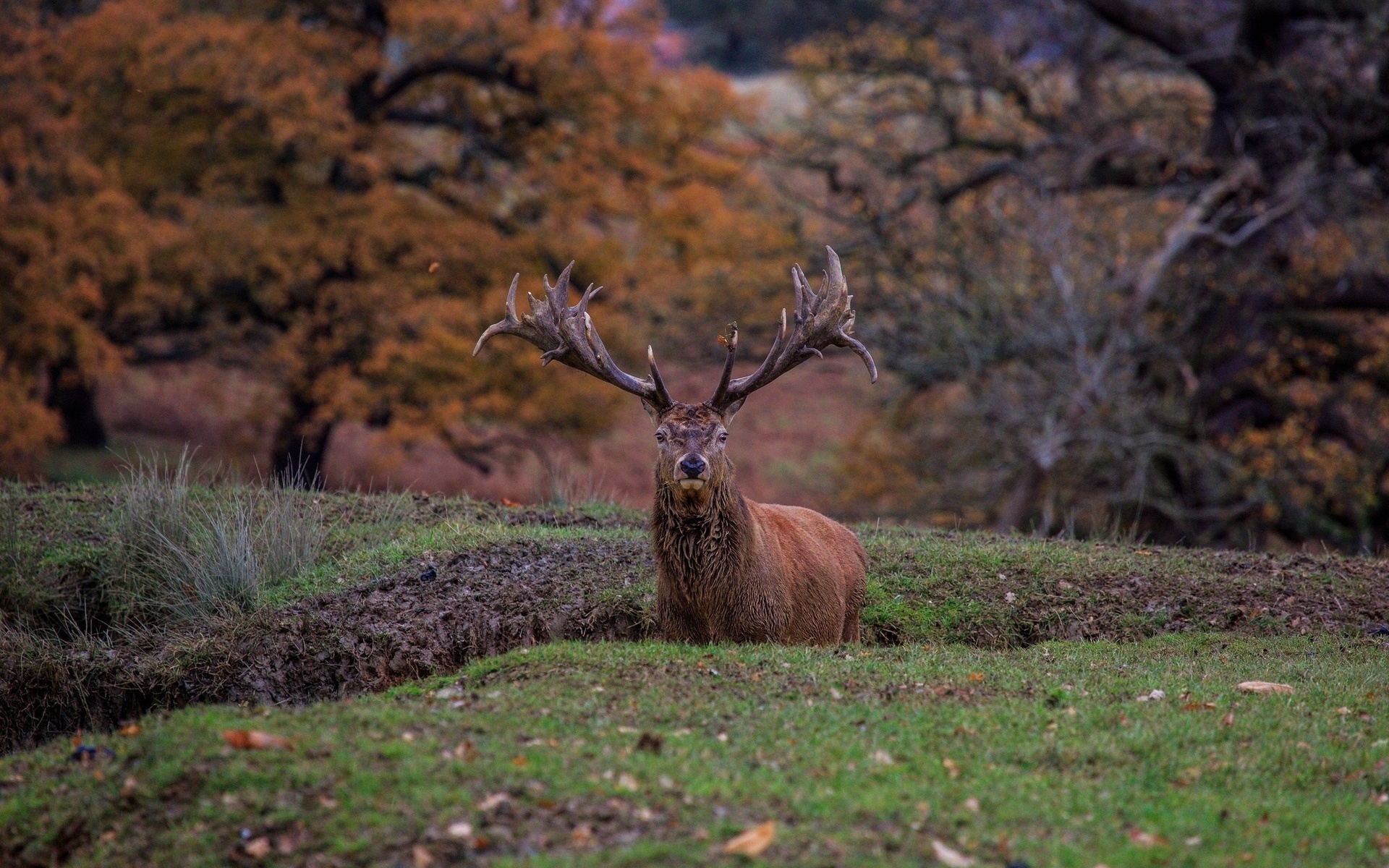 Description: A deer laying down in a field with trees in the background and grass and leaves on the ground and grass and trees in the foreground.