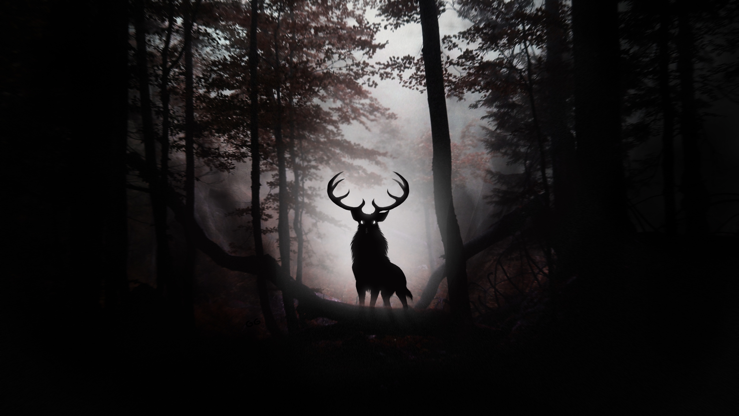 Description: A deer standing in the middle of a forest with trees in the background and fog in the air above.
