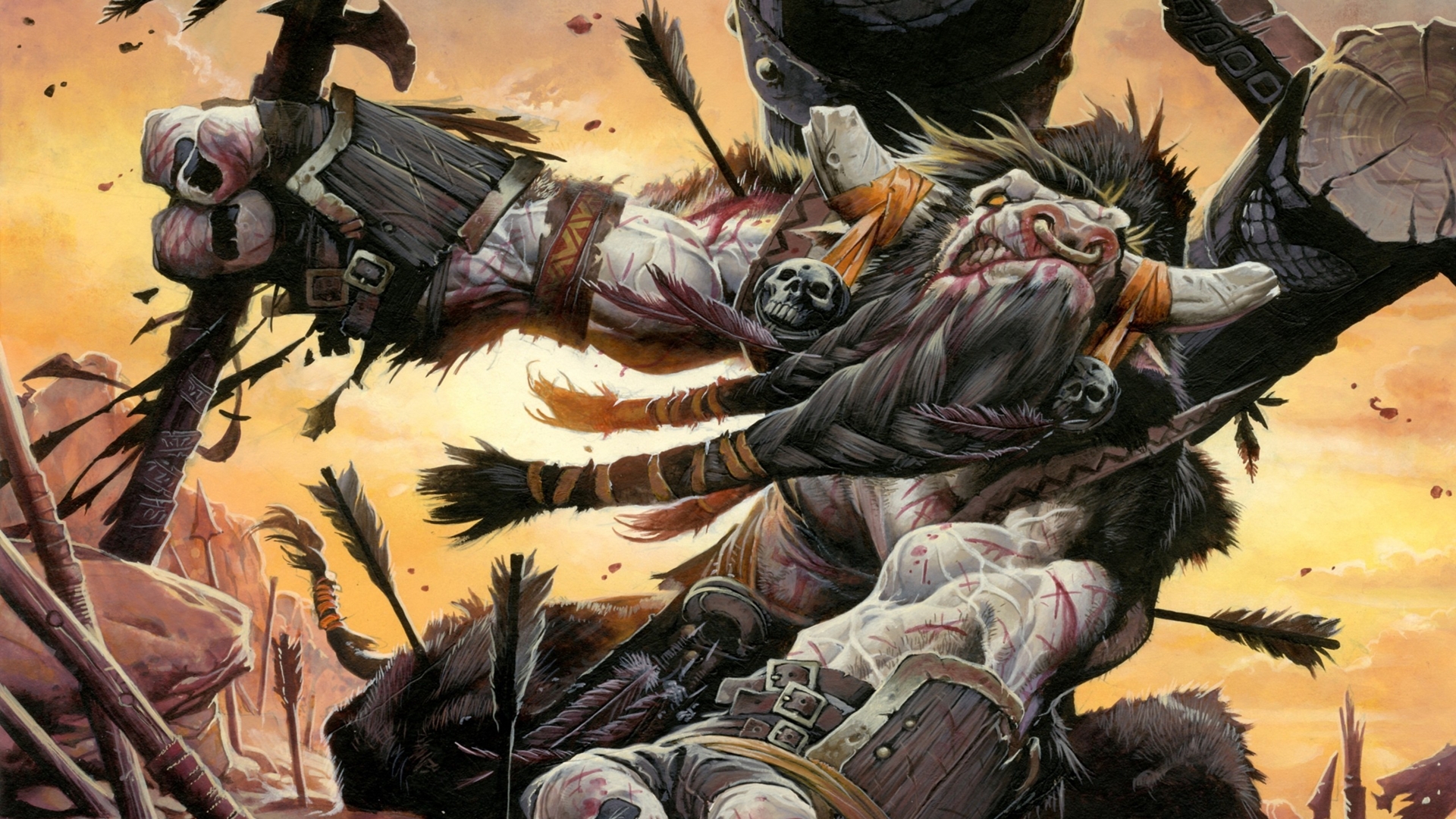 Description: A painting of a demon attacking a demon with a sword and a demon head on his back.