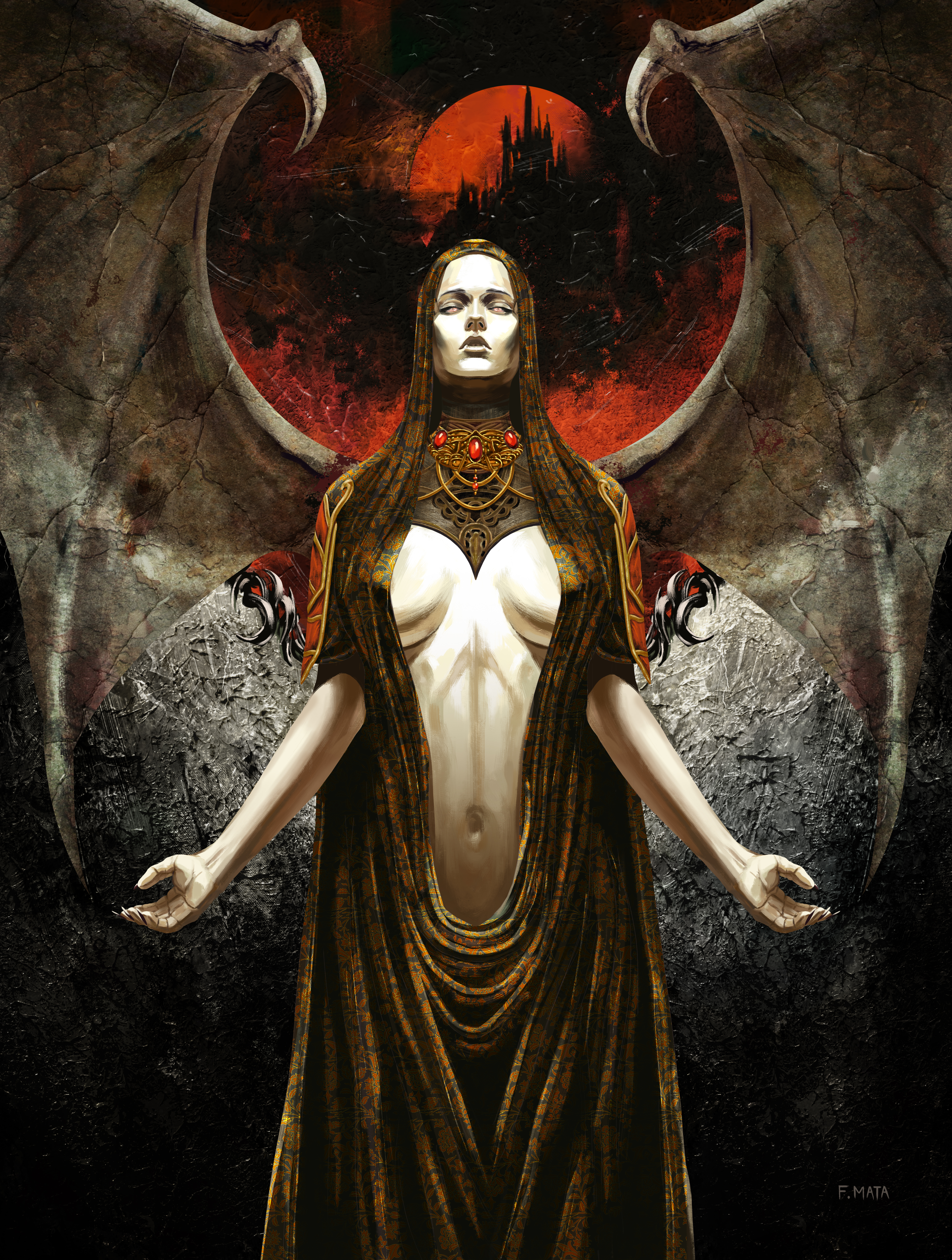 Description: A woman with a huge breast and wings standing in front of a red moon and a castle with a red moon behind her.