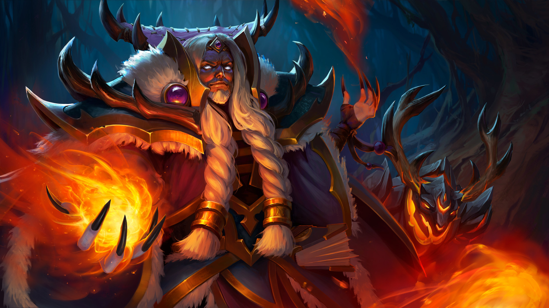 Description: A demon with horns and a demon face holding a fire ball in his hands and a demon face on his chest.
