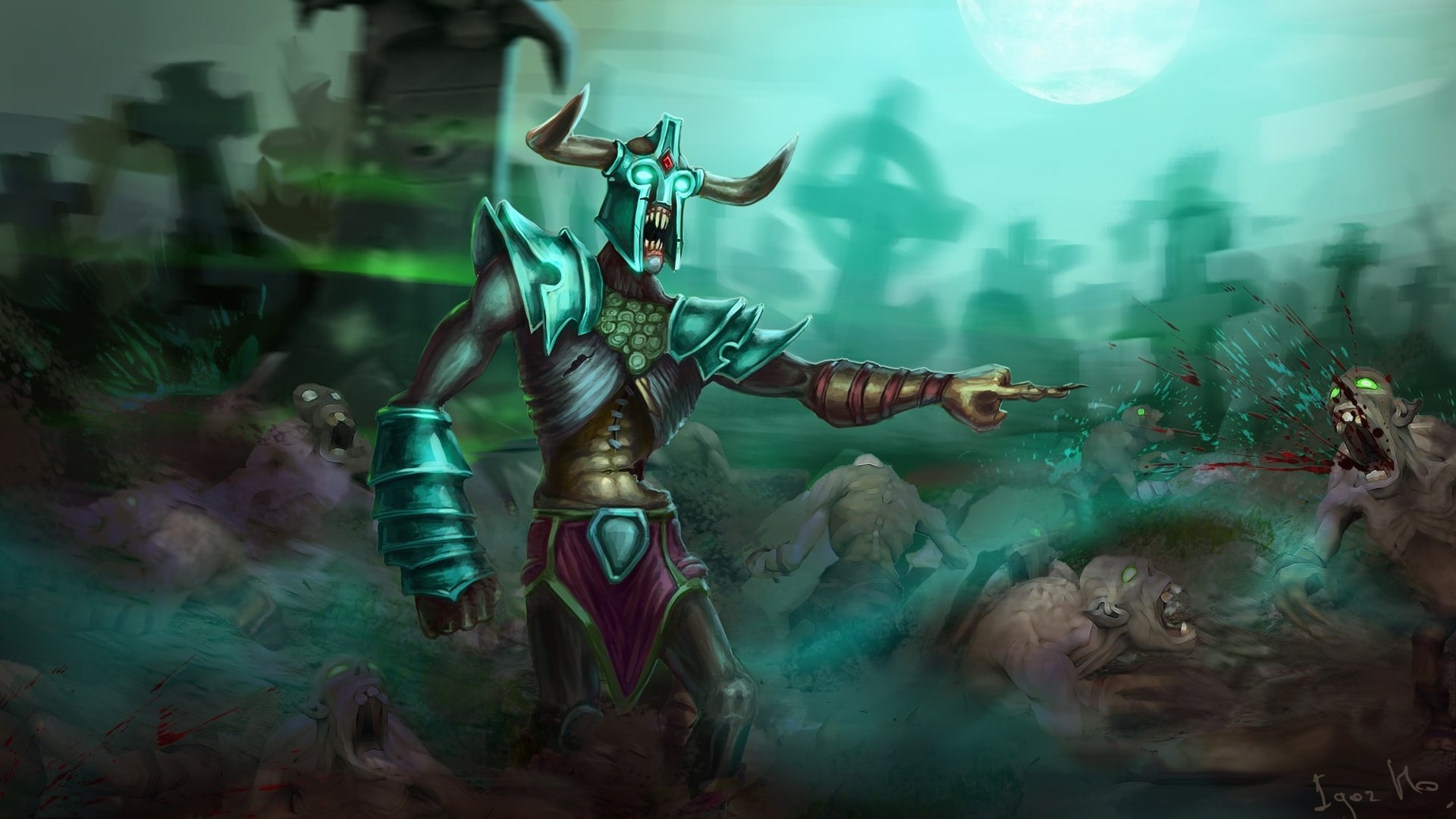 Description: A painting of a demon with horns and a demon like body holding a sword in his hand and a demon like body in the background.