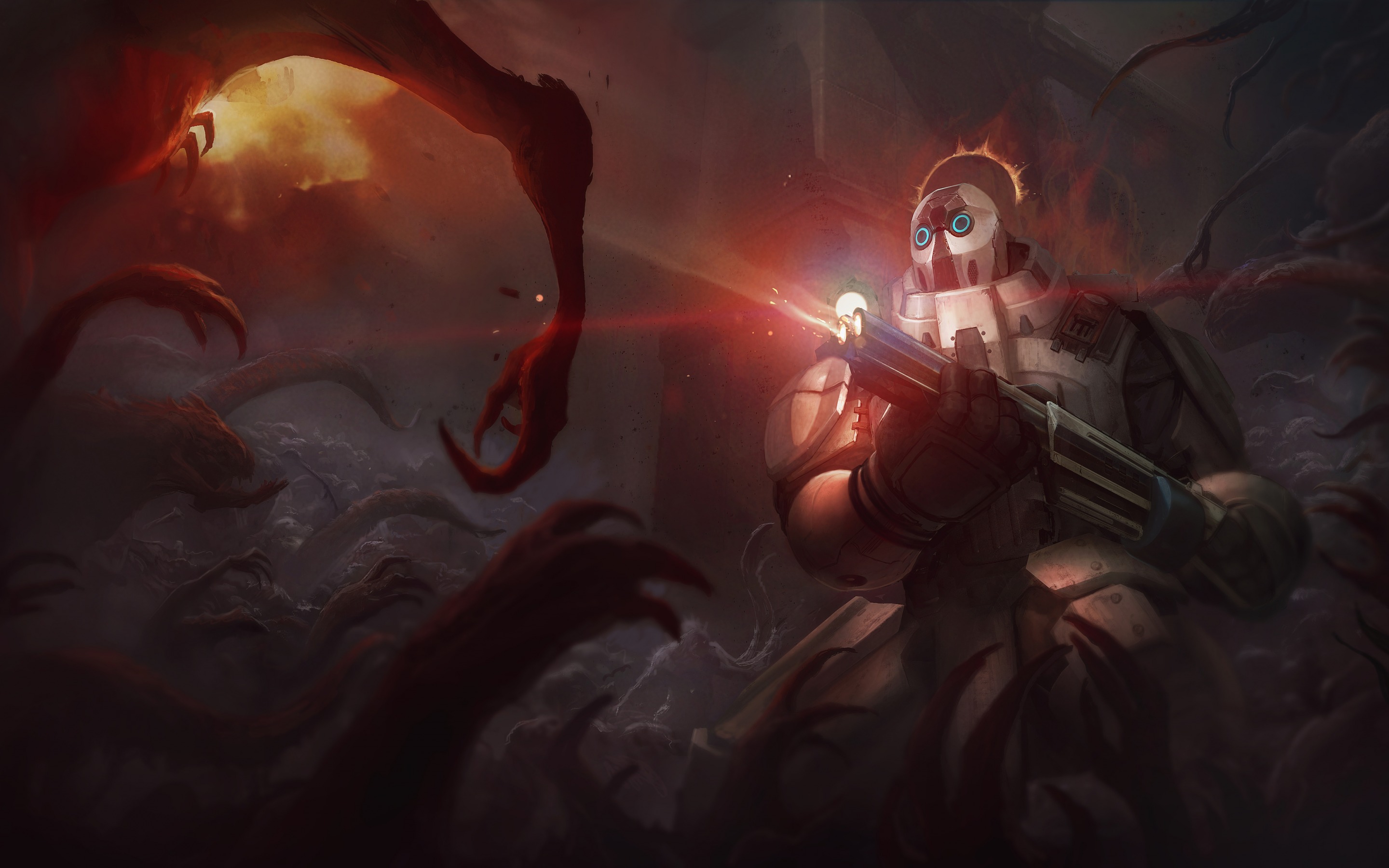 Description: A man holding a gun in a dark room with a demon in the background and a demon in the foreground.