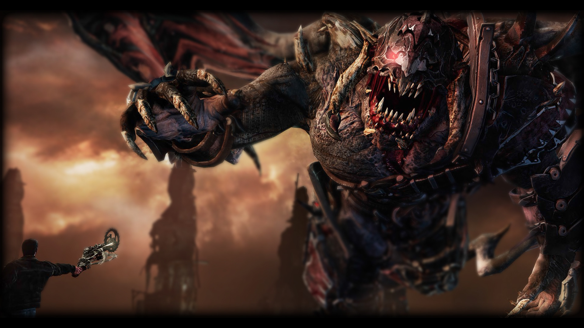 Description: A demonic creature with a bloody face and sharp teeth is attacking a man in a dark suit with a sword.