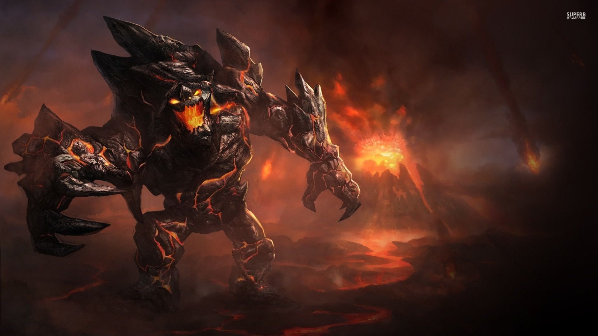 Description: A demonic looking creature in a dark forest with flames in the background and a fireball in the foreground.