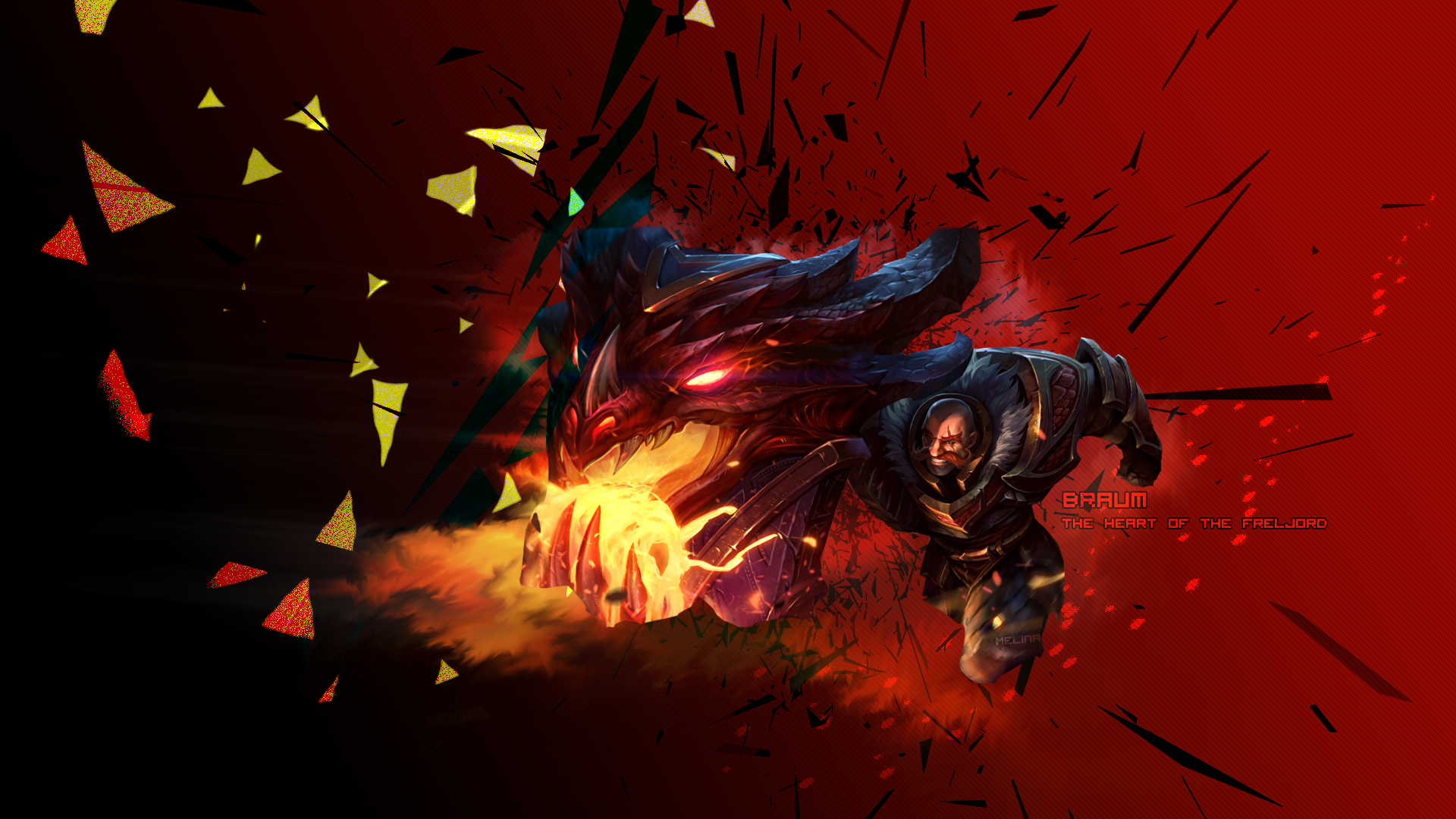 Description: A demonic looking creature with a fire in its mouth and a red background with yellow and red triangles around it.