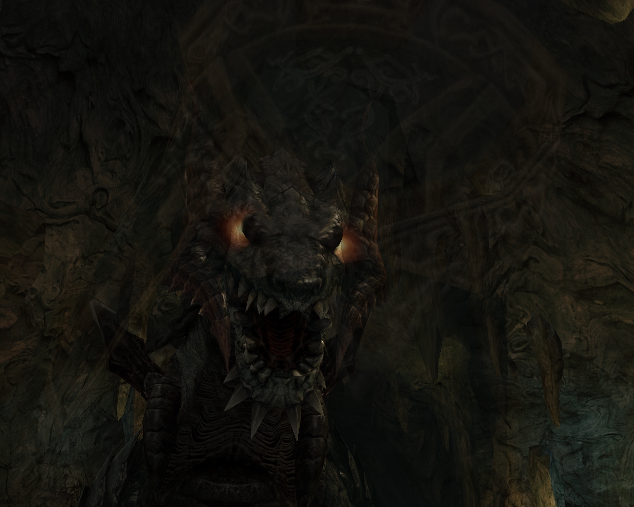 Description: A demonic looking creature with glowing eyes and a large mouth in a cave like setting with a stone wall.