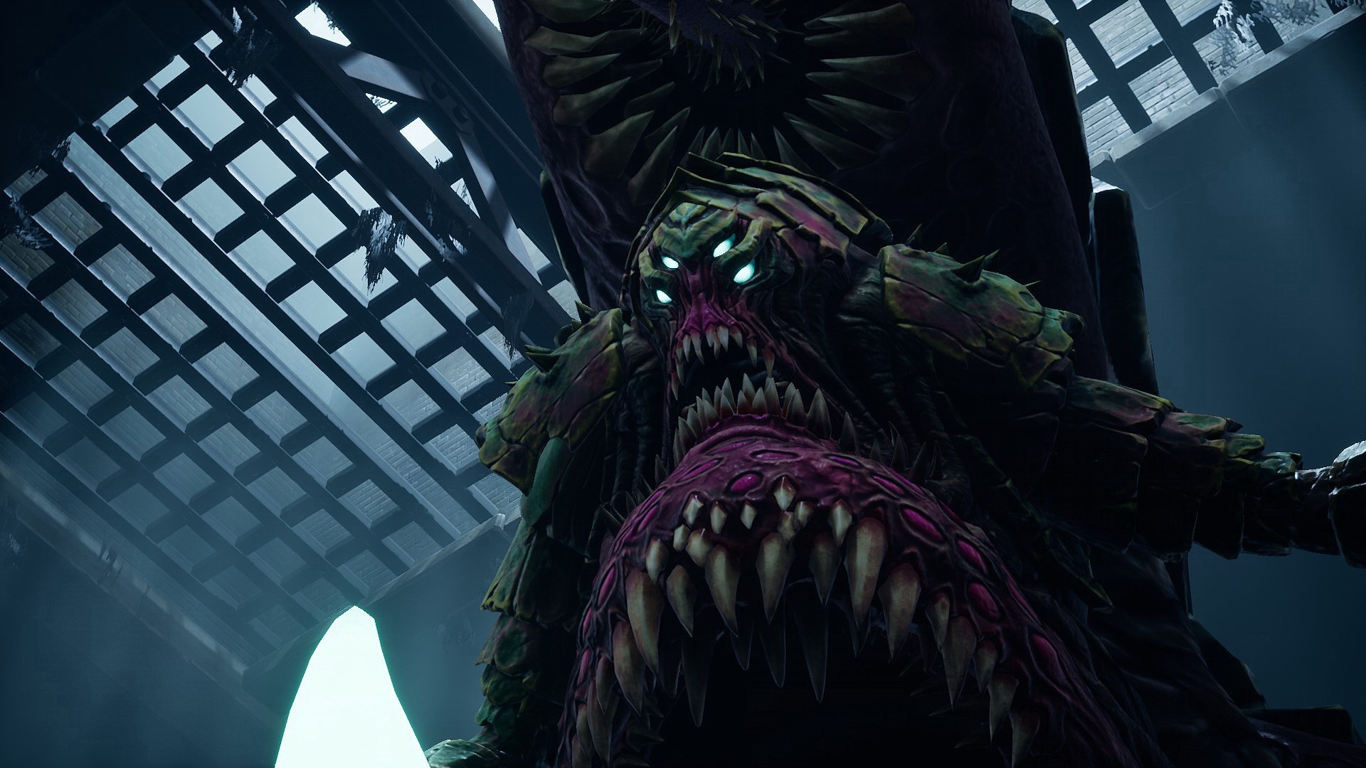Description: A demonic creature standing in a dark room with a light on it's face and arms.