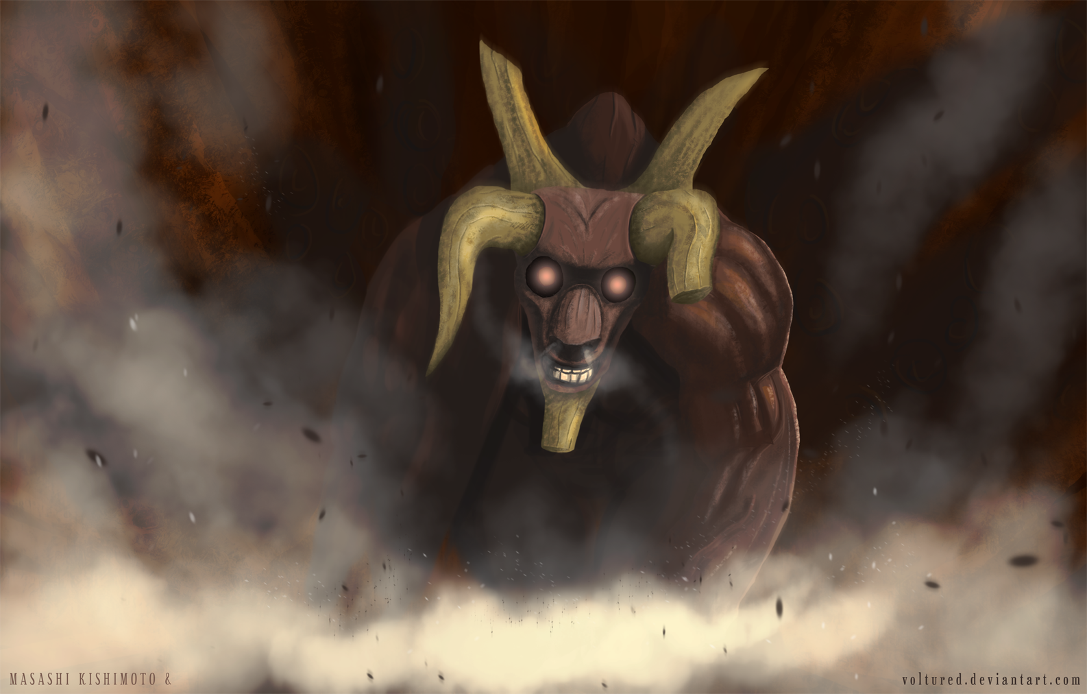Description: A demonic demon with horns and a demonish face in a smokey area with clouds and smoke behind it.