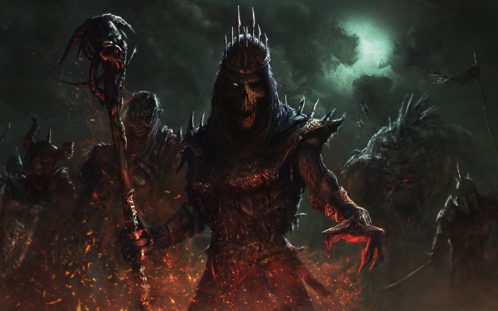 Description: A demonic demon with a staff in a dark forest with flames and smoke behind him is a demon with a staff in his hand.
