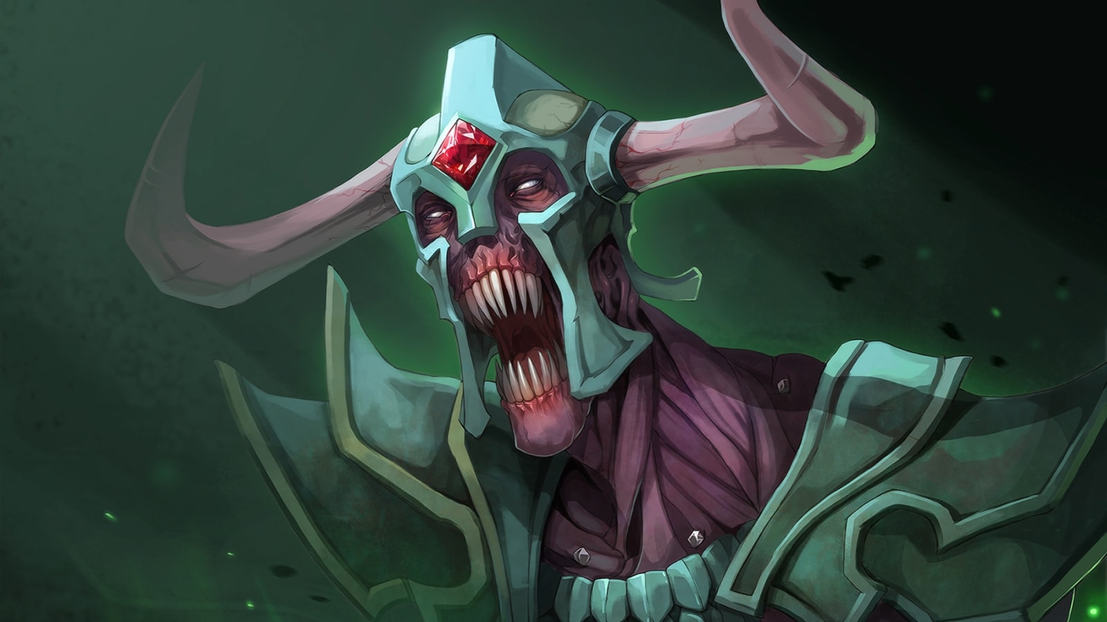 Description: A demonic looking demon with horns and a red eye on his face and a green background with a red light.