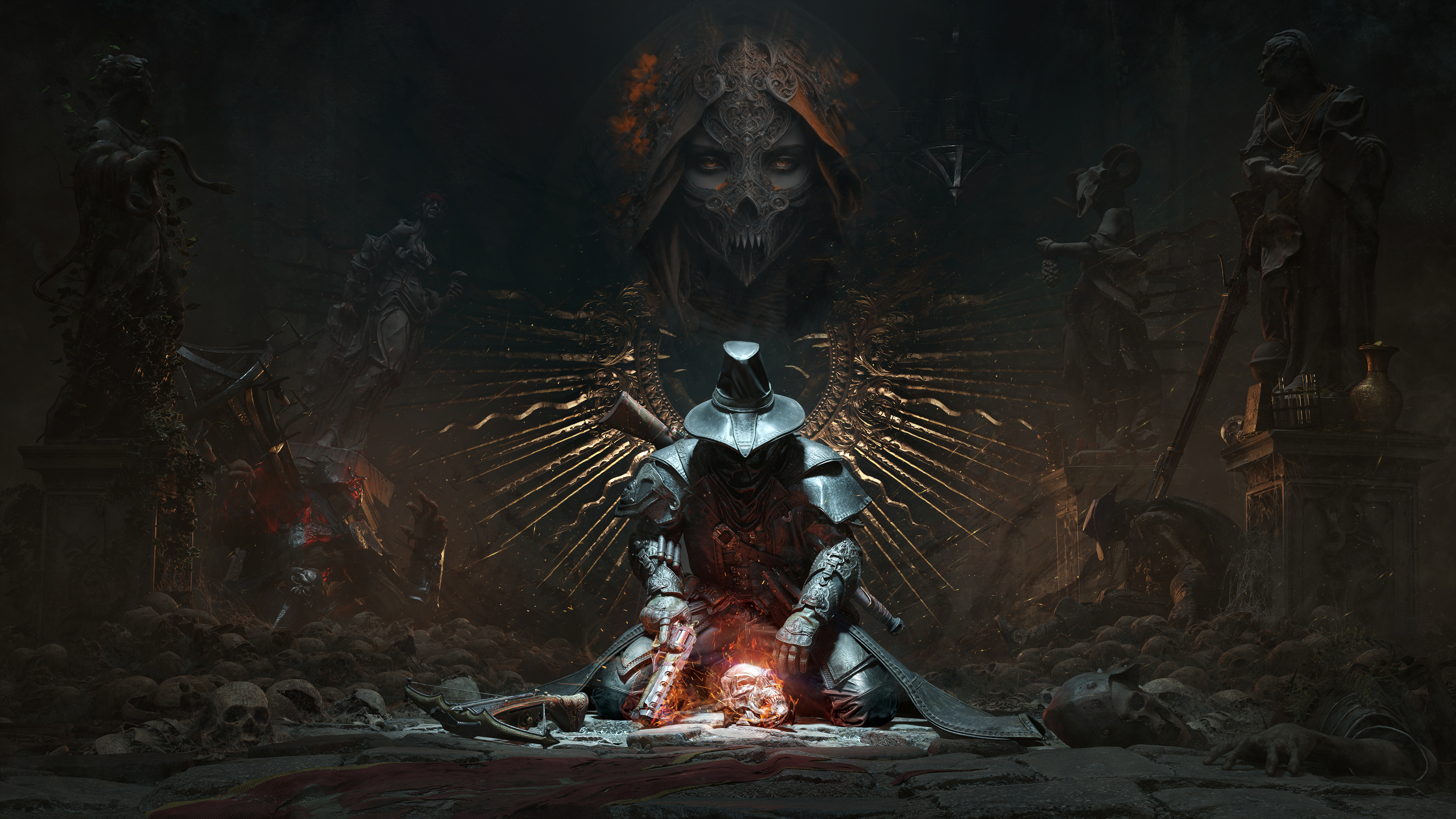 Description: A demonic looking knight sitting on a throne in a dark room with a fire in the middle of the floor.