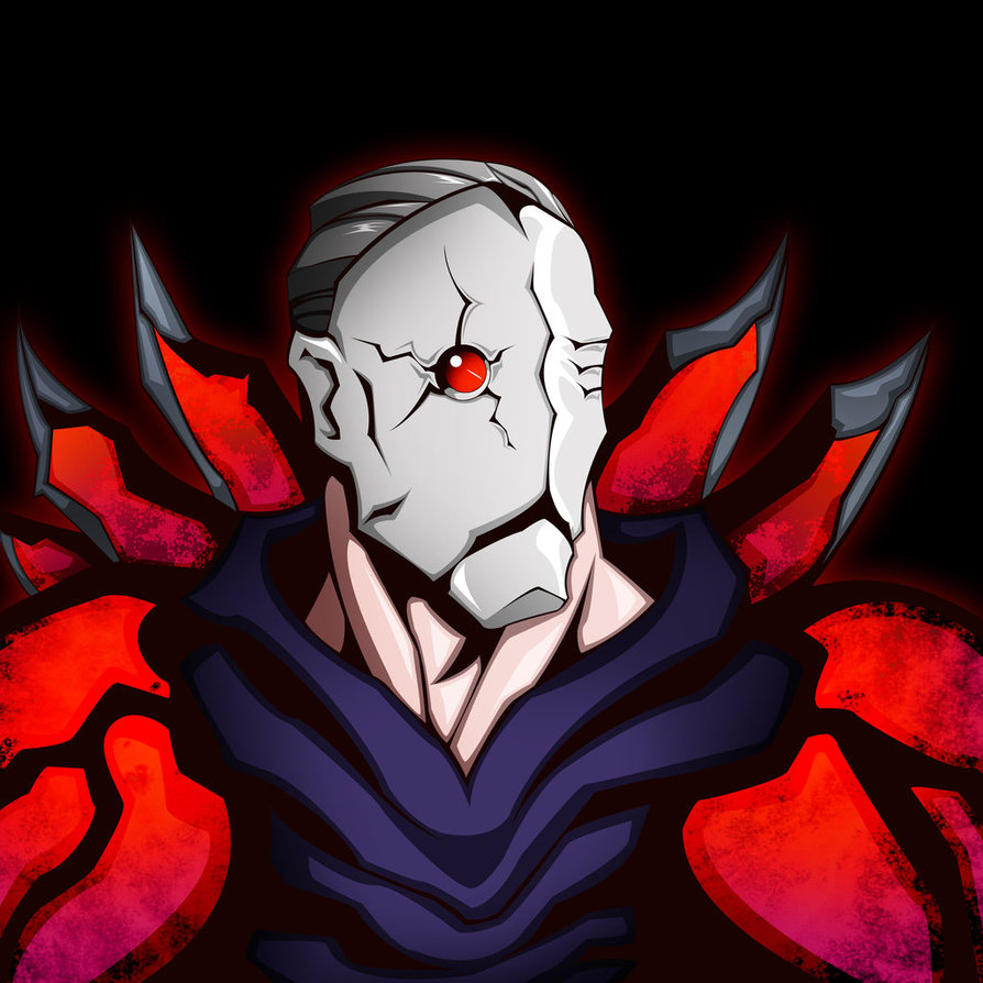Description: A stylized image of a demonic looking man with red eyes and a white mask on his face and a red eye.
