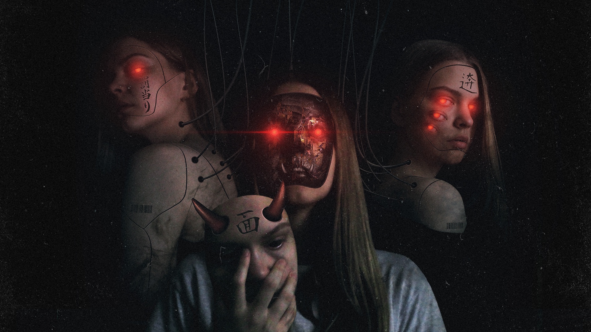 Description: A woman holding a knife in front of her face with red lights on her face and a demonic looking face.