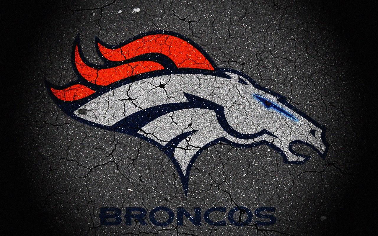 Description: A denver football logo painted on the side of a cracked asphalt road with the word denver written on it.