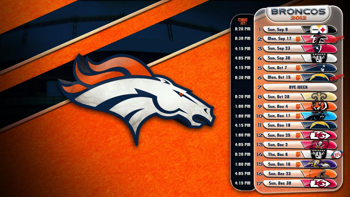 Description: A denver football team logo on a wallpaper background with a football field and a football helmet on it.