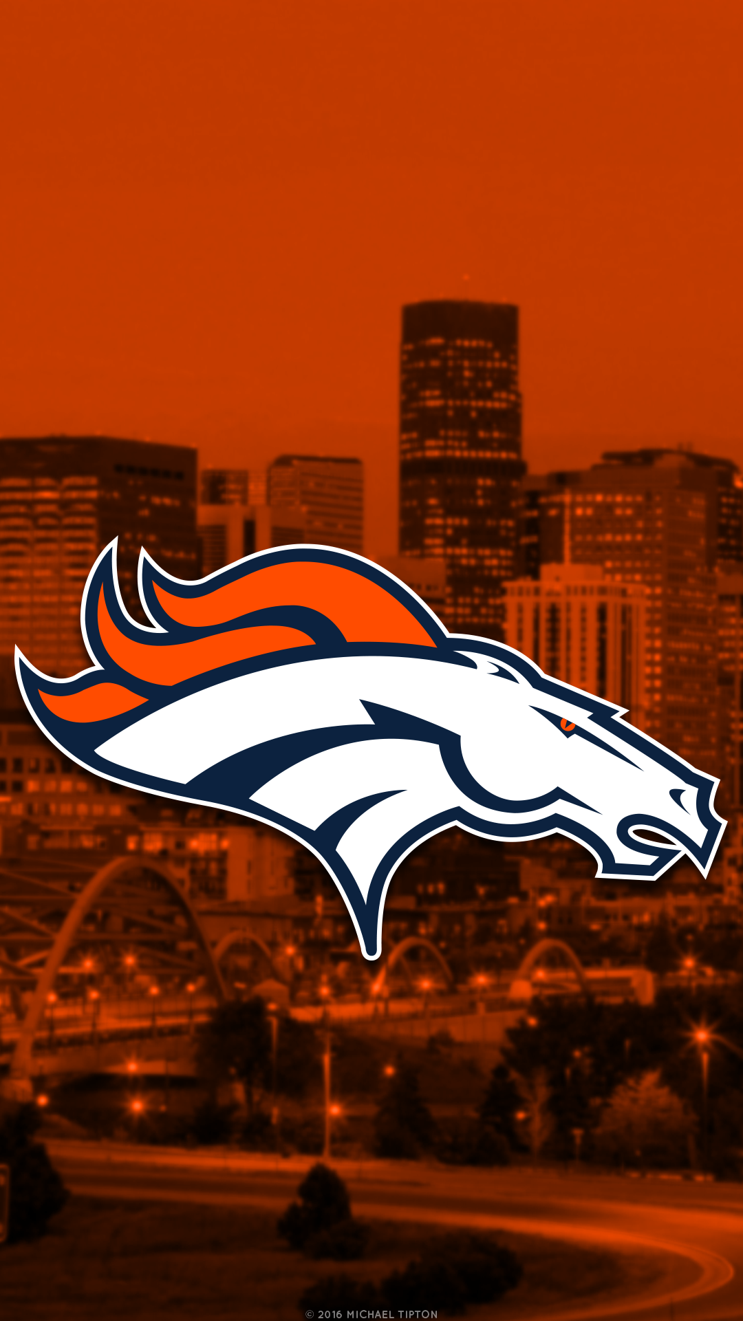 Description: A denver football team logo in front of a city skyline with the denver skyline in the background and a red and orange sky.