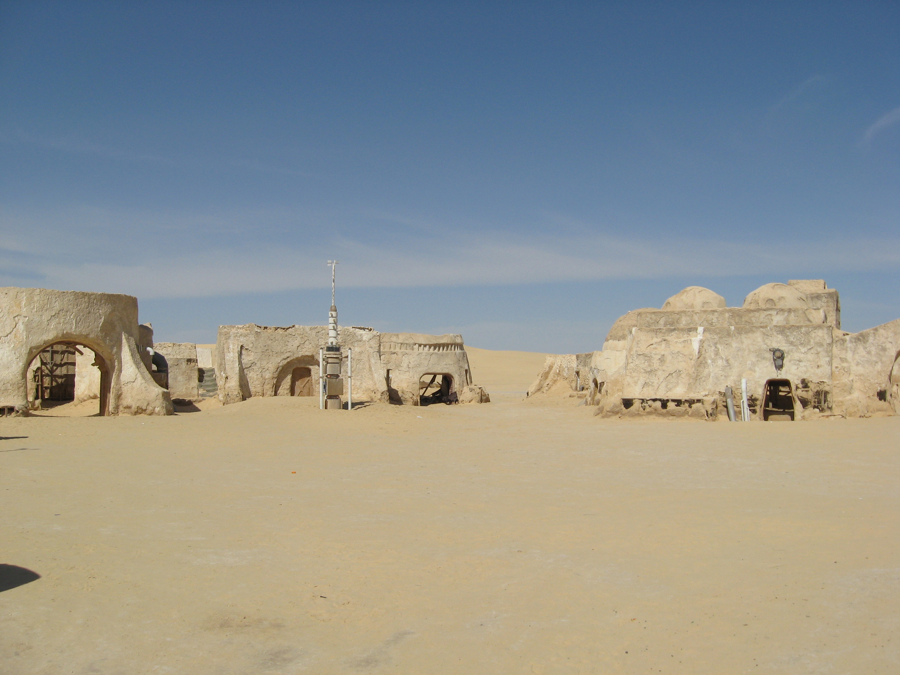 Description: A desert with a few buildings and a sky background with clouds in the distance and a few people standing in the foreground.
