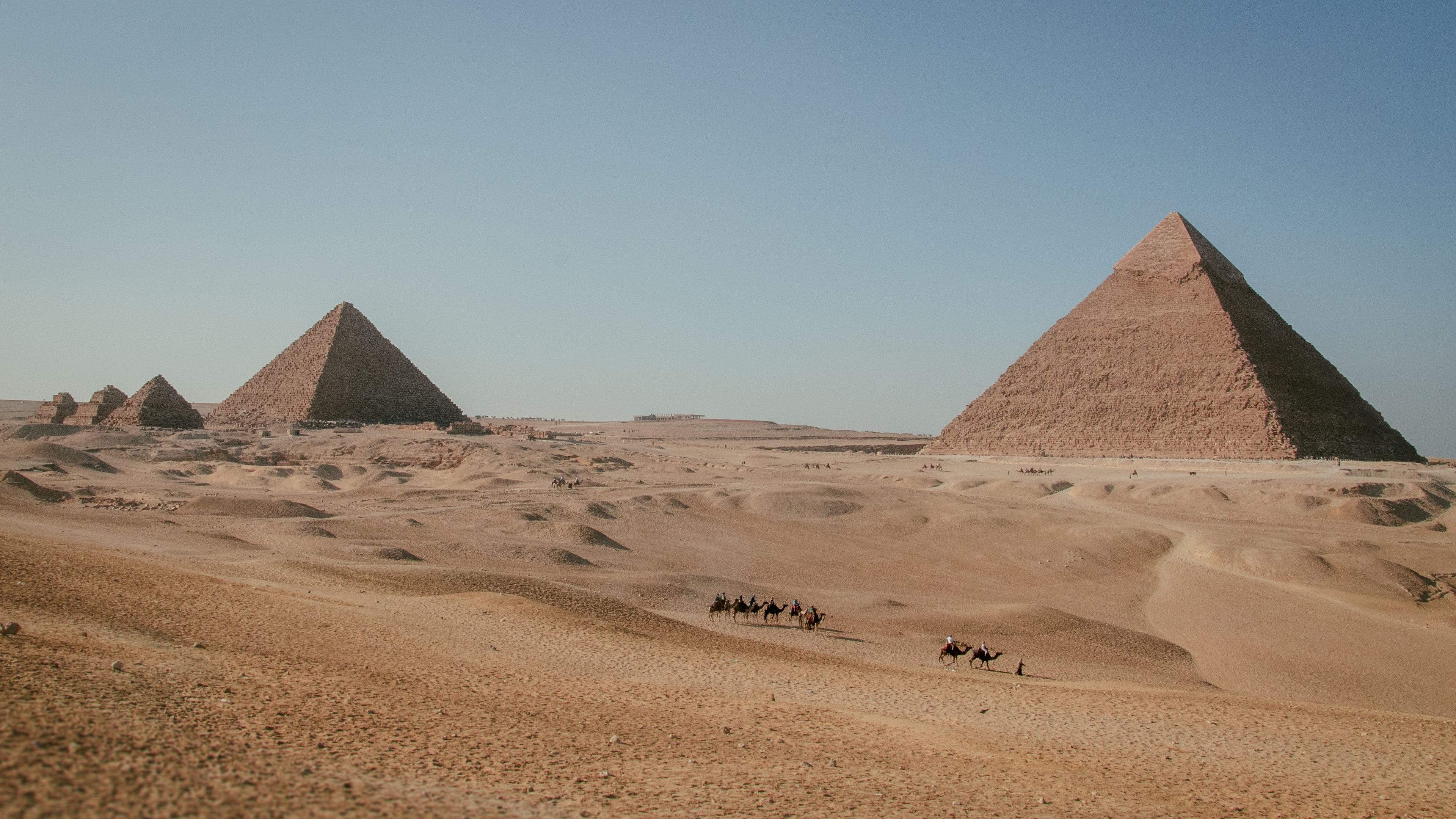 Description: A group of people riding camels through a desert near the pyramids of giza.