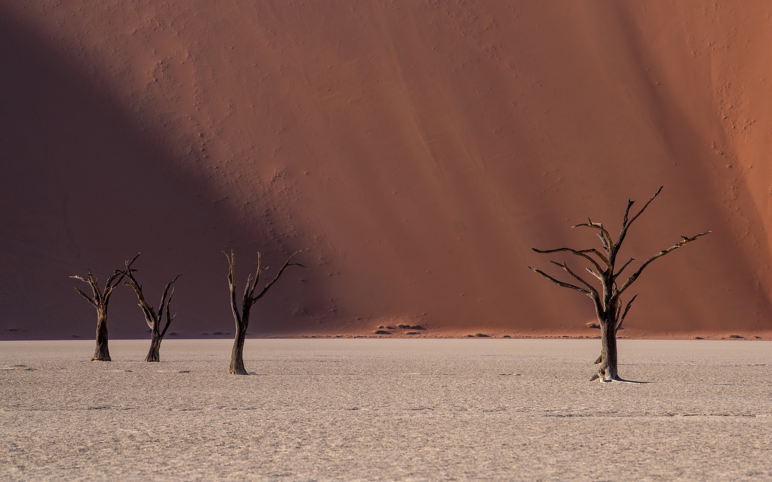 Description: A group of dead trees in the desert with a sand dune in the background and a person walking by.