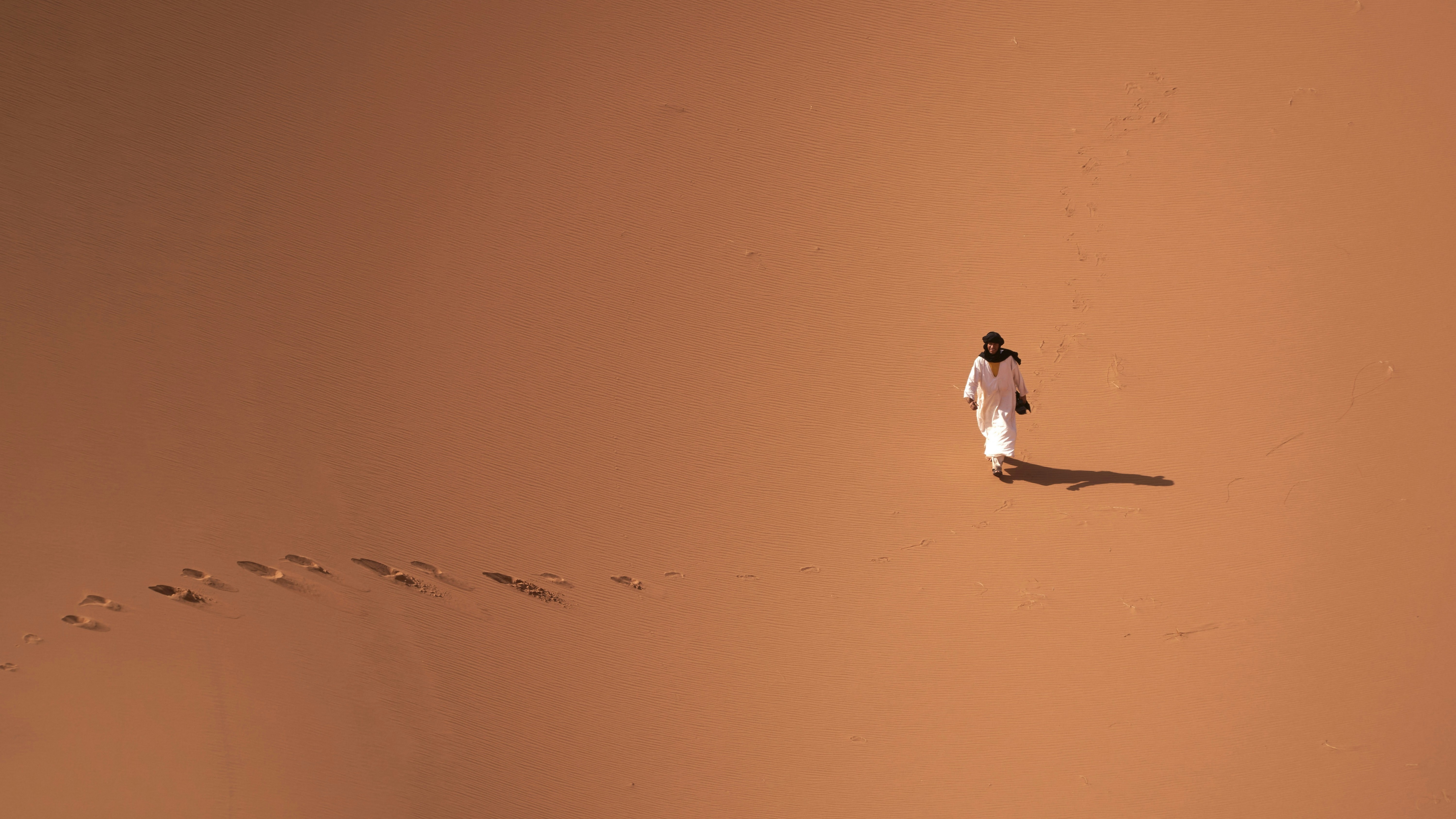 Description: A person walking in the desert with footprints in the sand and a bird's eye view of the ground.