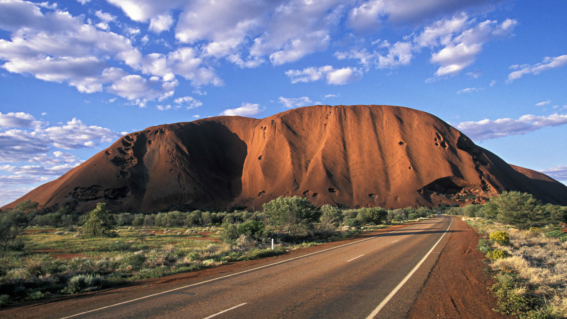 Description: A road going past a large mountain in the desert with a sky background and clouds in the sky above.