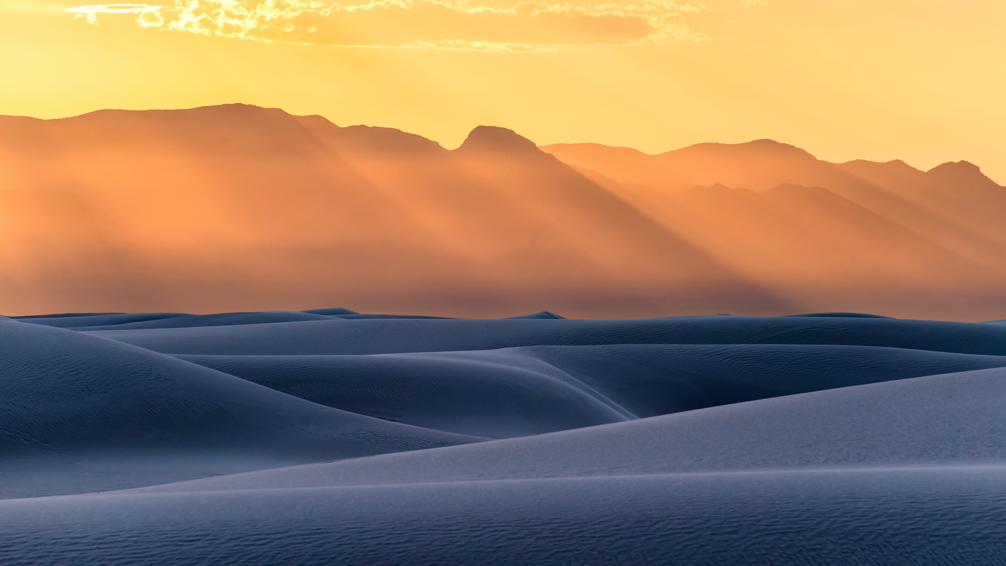 Description: A desert landscape with mountains in the background and sun rays coming through the clouds in the sky above it.