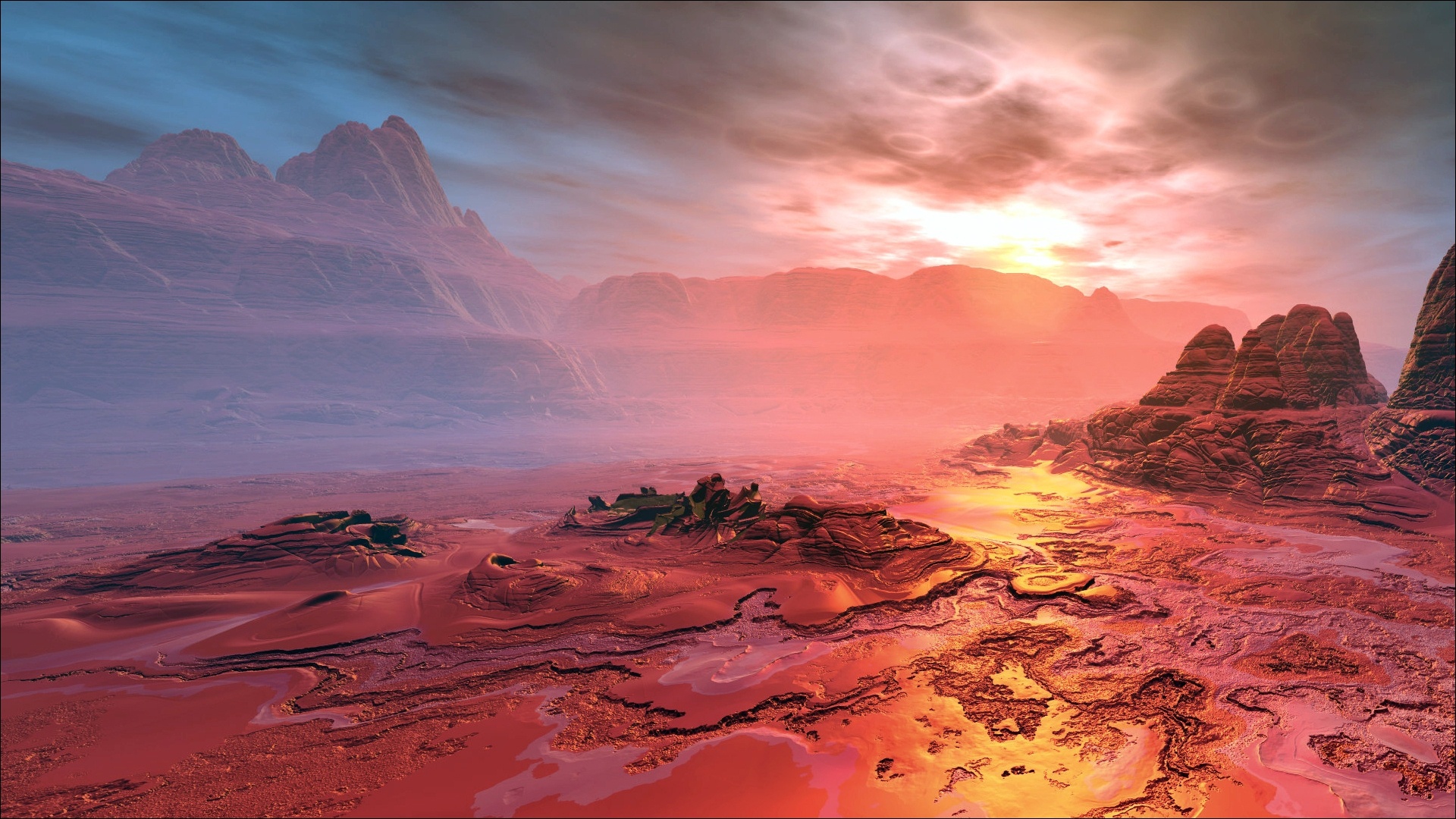 Description: A computer generated image of a desert with a river running through it and mountains in the background at sunset.