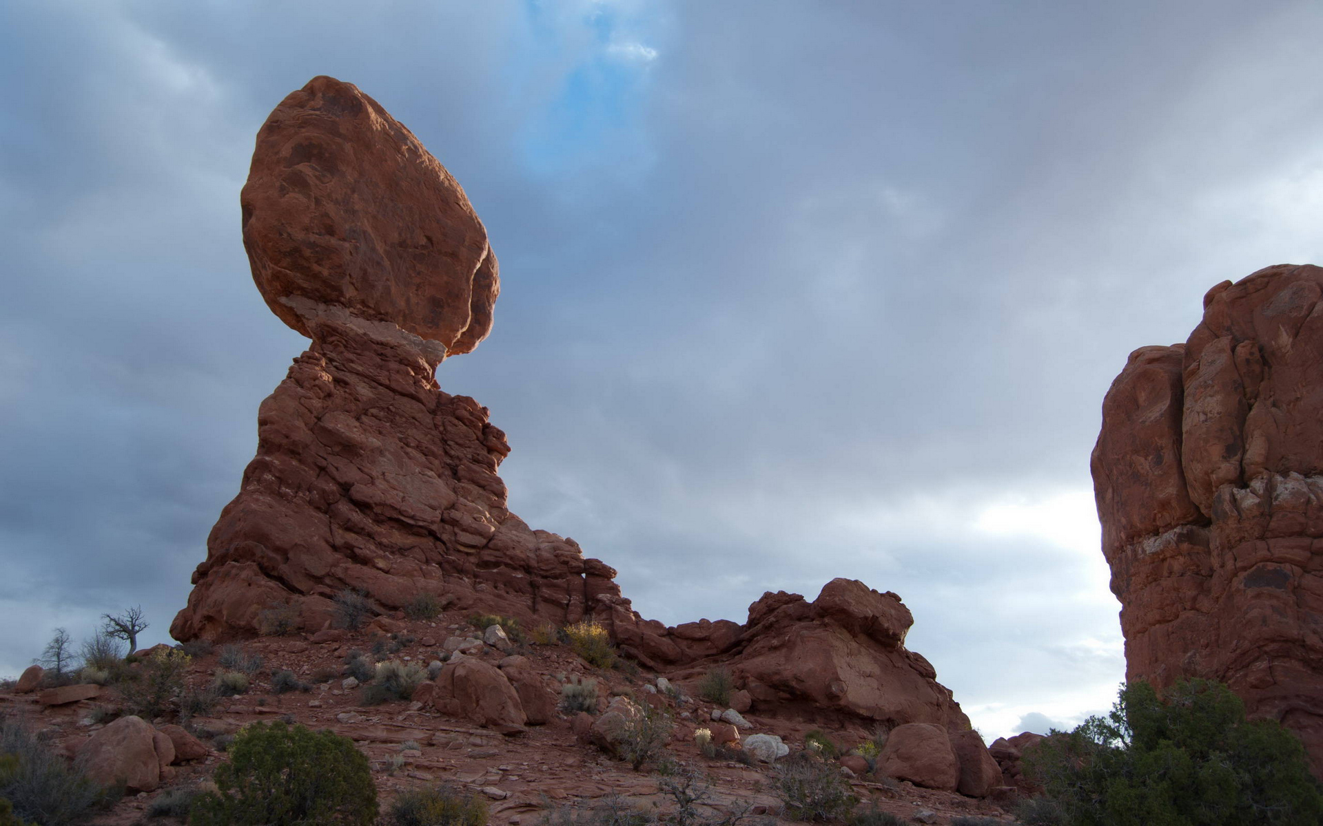 Description: A rock formation in the desert with a sky background and clouds in the background.