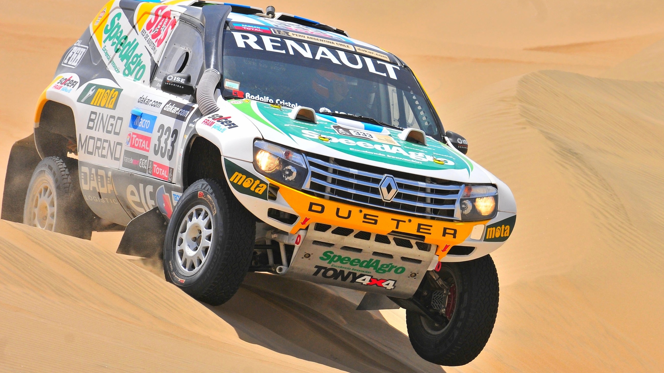 Description: A truck driving through the desert on a sand dune trail in the desert.