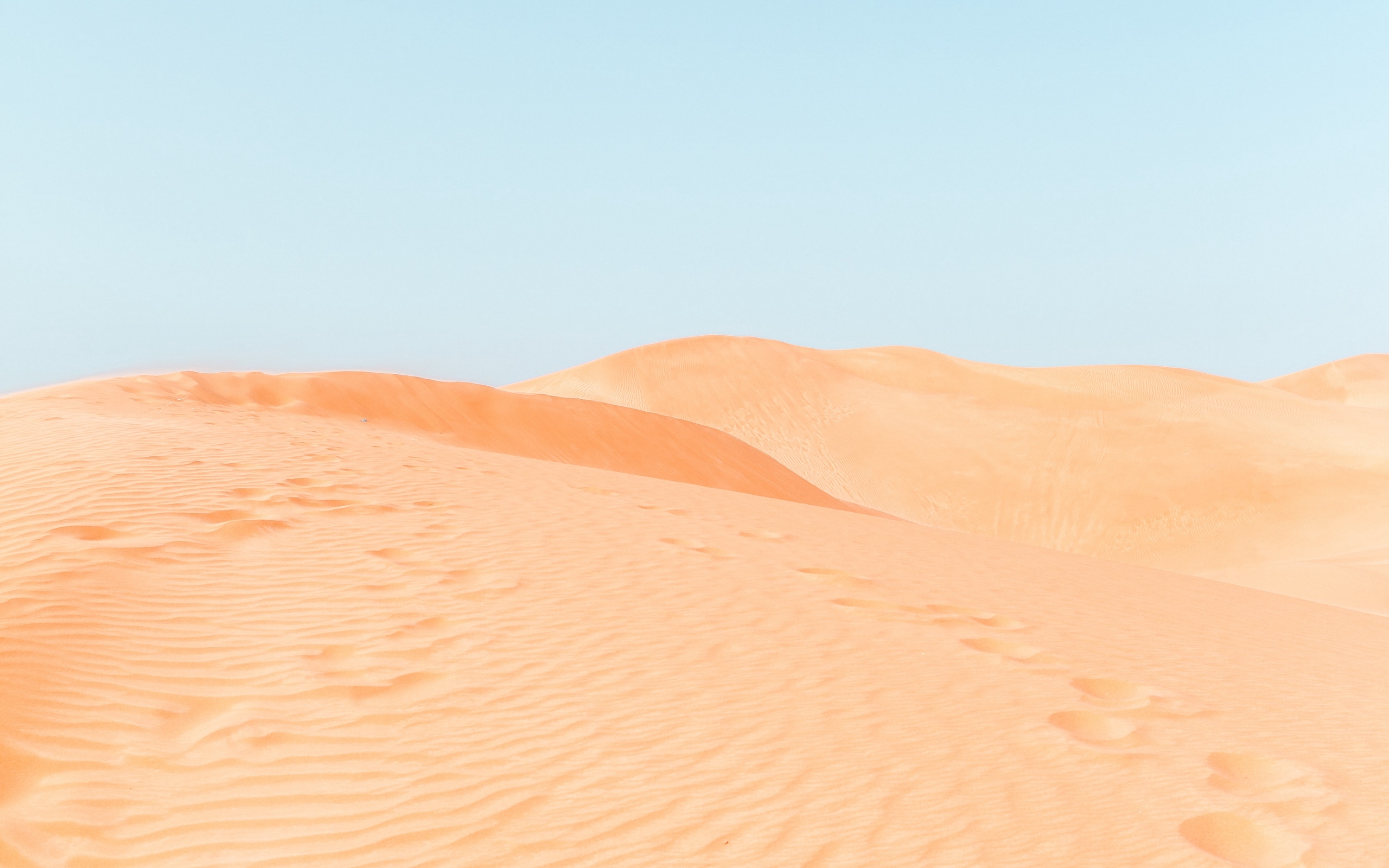 Description: A person walking across a sandy desert with footprints in the sand and a blue sky in the background.