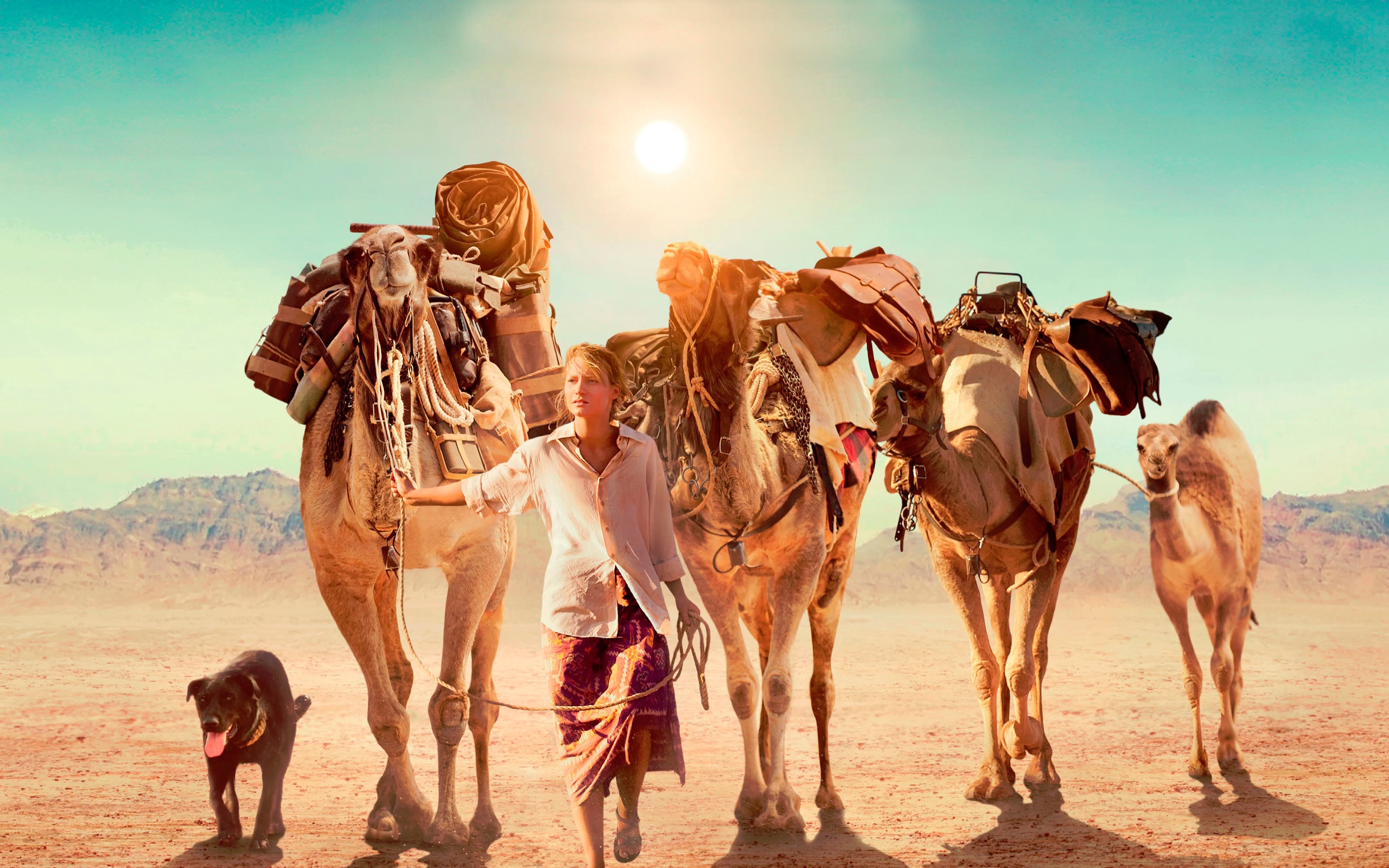 Description: A woman walking a dog in the desert with three camels and a man on a horse with a dog.
