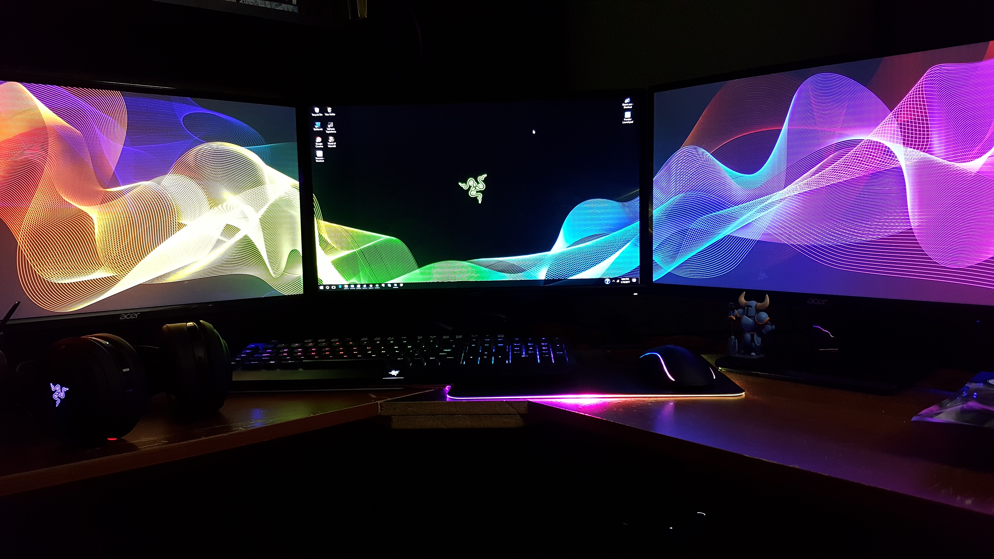 Description: A desk with three monitors and a keyboard on it with a mouse and a controller on it.