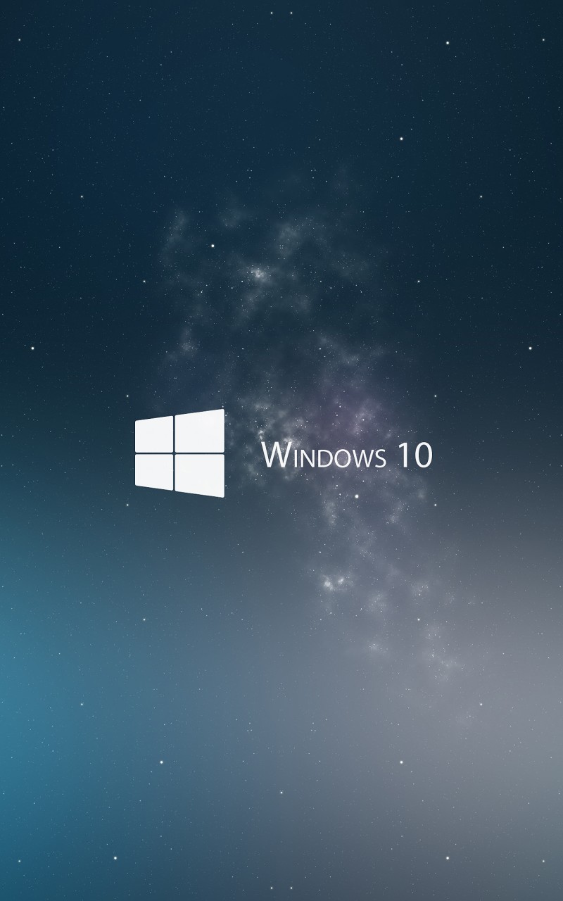 Description: A desktop computer with the windows 10 logo on it's screen and a galaxy background behind it.