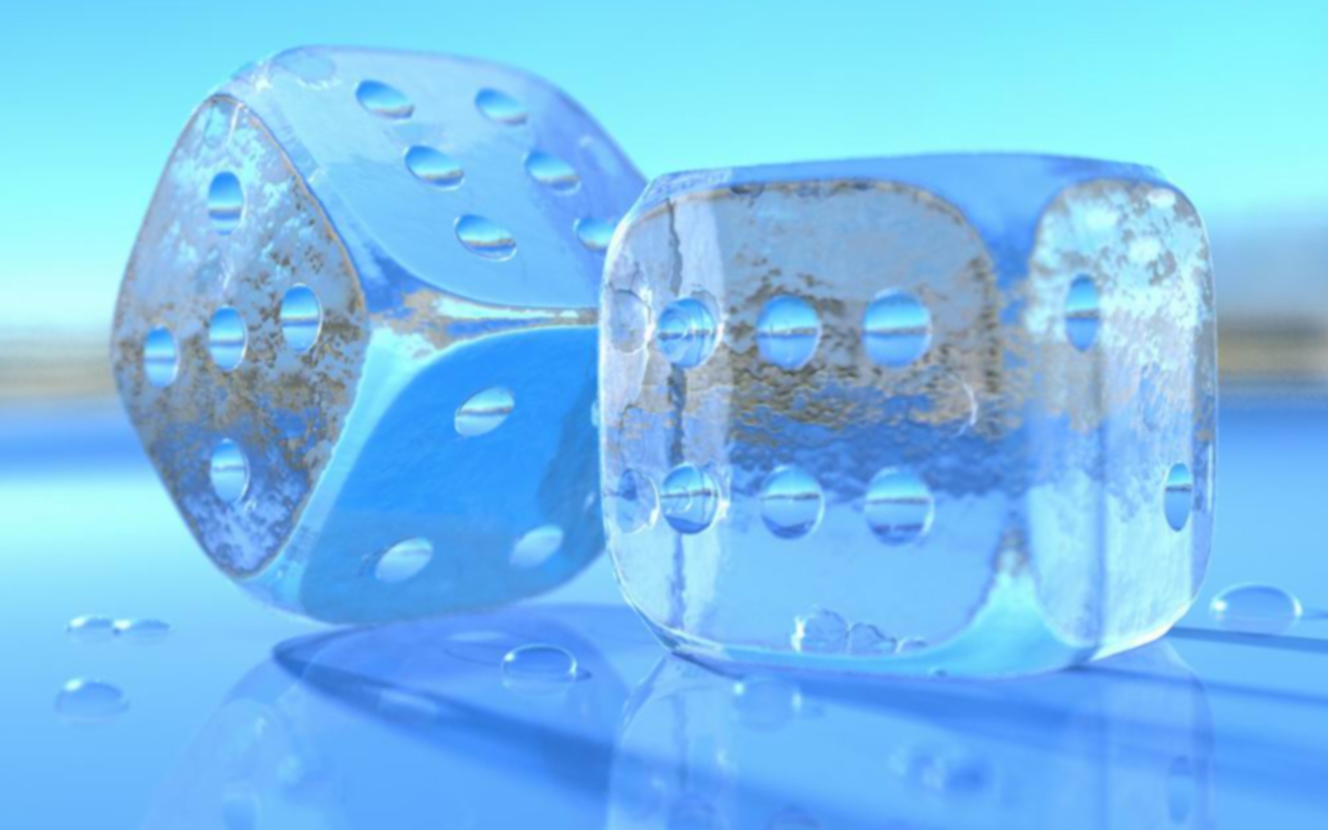 Description: Two dices are sitting on a shiny surface with water droplets on them and a blue sky in the background.