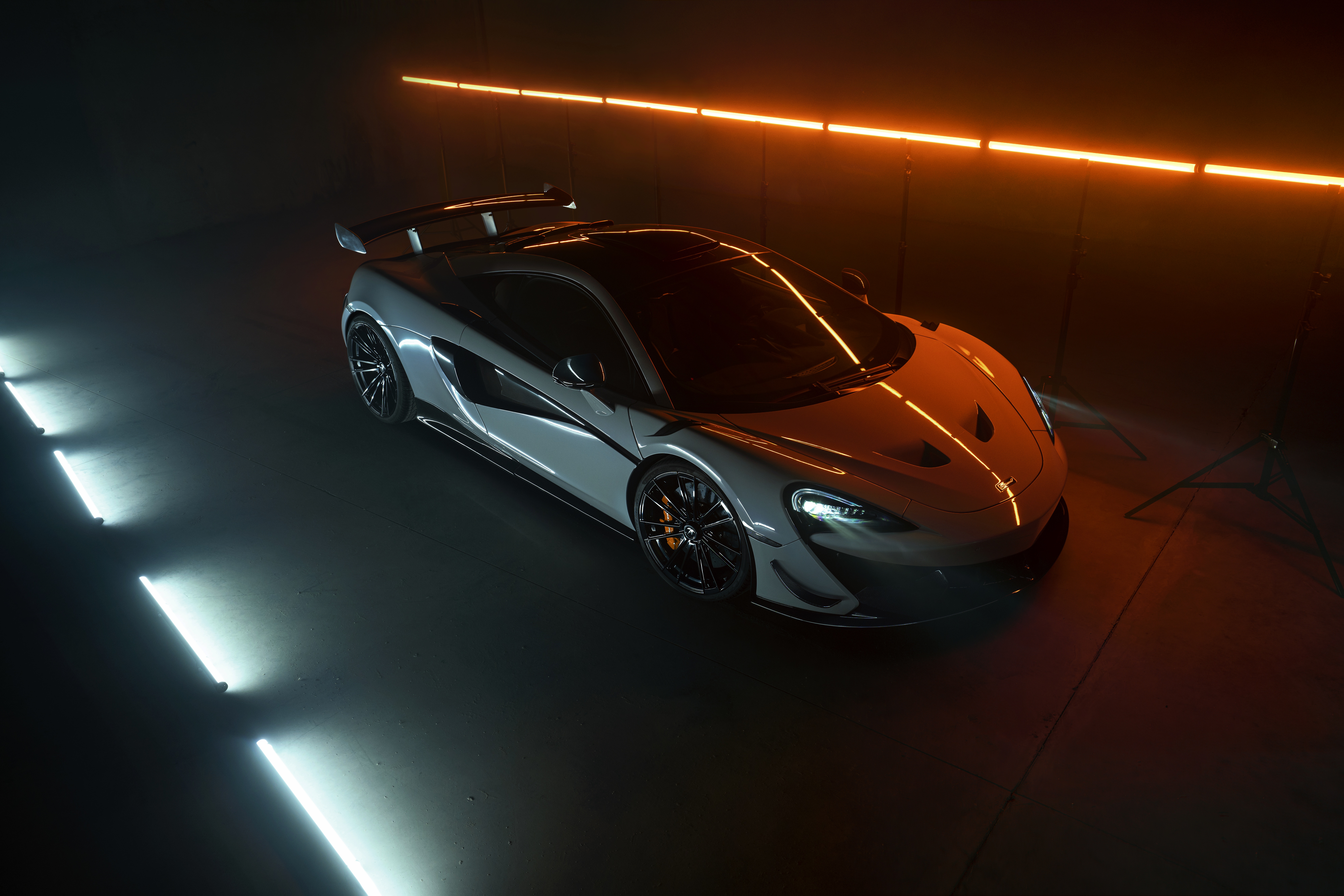 Description: A car is shown in a dimly lit room with lights on the floor and a black background with a red light.