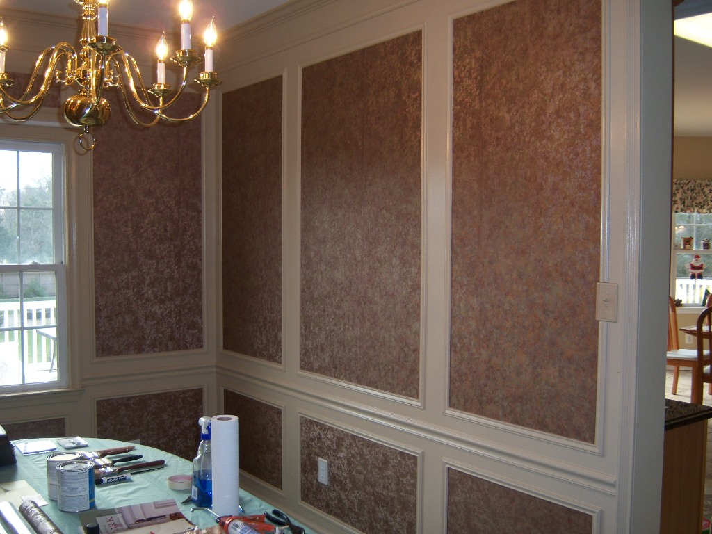 Description: A dining room with a chandelier and a table with a laptop on it and a chandelier hanging from the ceiling.