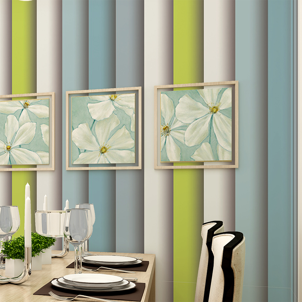 Description: A dining room with a table and chairs and a wall with paintings on it and a vase with flowers.