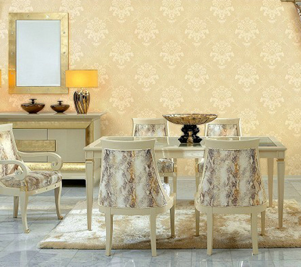 Description: A dining room with a table and chairs and a mirror on the wall above it and a vase on the table.