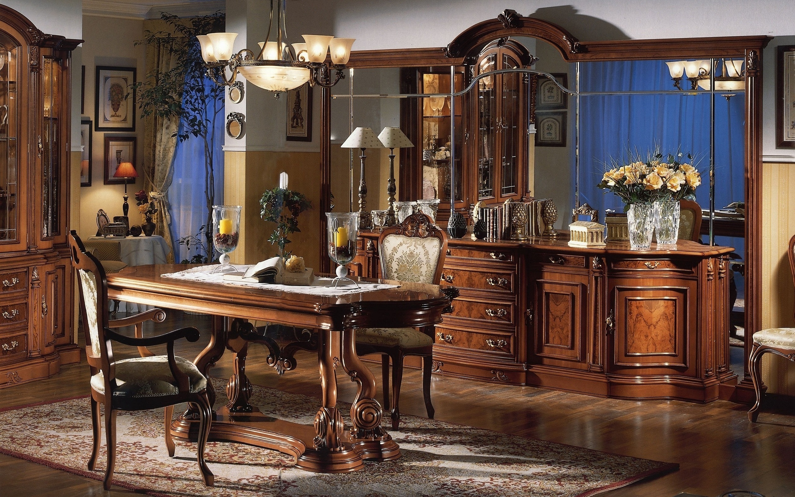 Description: A dining room with a table and chairs and a china cabinet with a mirror on it and a chandelier.