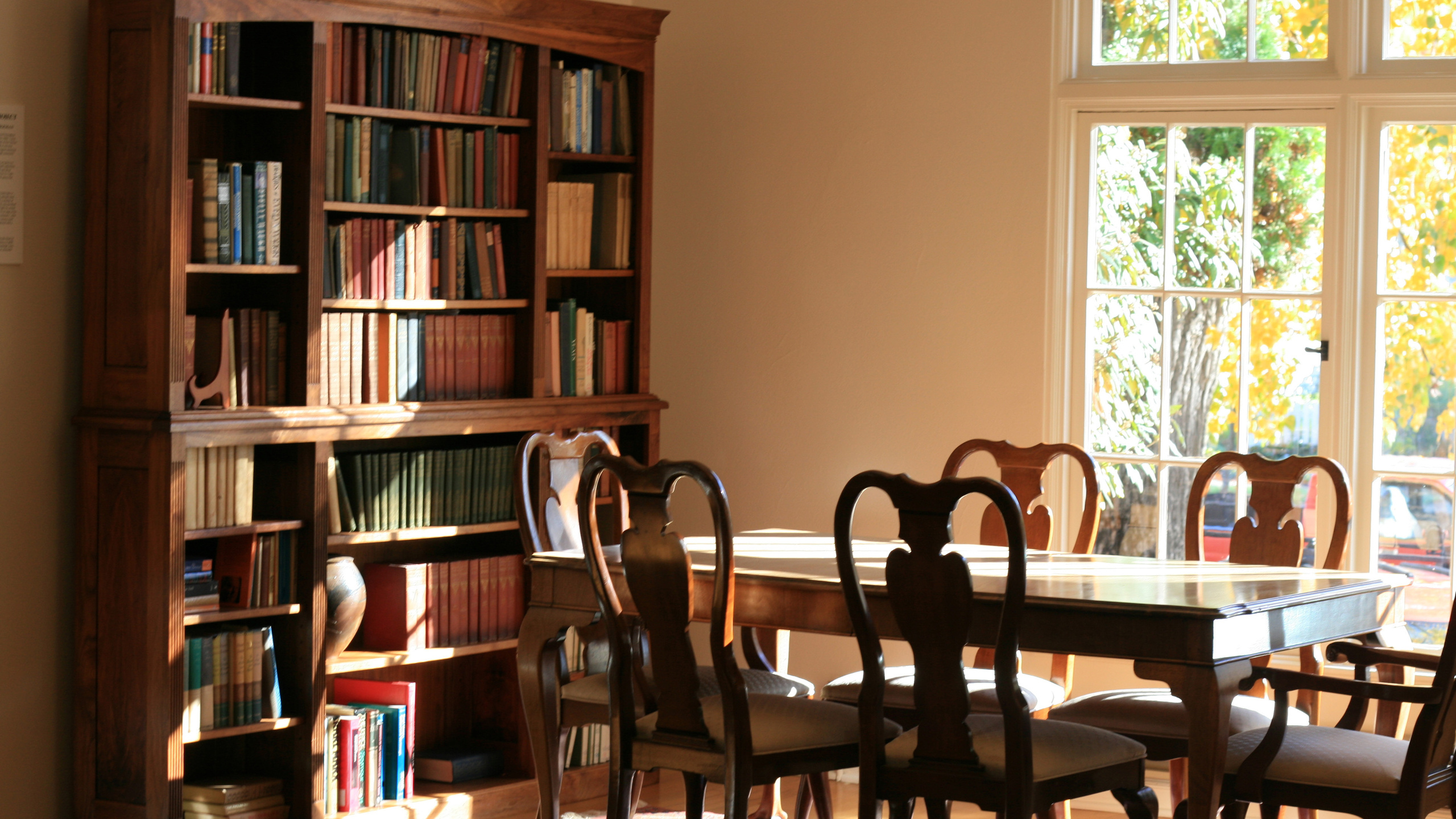 Description: A dining room table with chairs and a bookcase in the background with a window open to the outside.